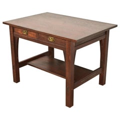 Table en chêne du début du 20e siècle. De forme rectangulaire en chêne foncé, elle comporte deux feuilles en forme de croissant et un tiroir central en frise à queue d'aronde. Pied...