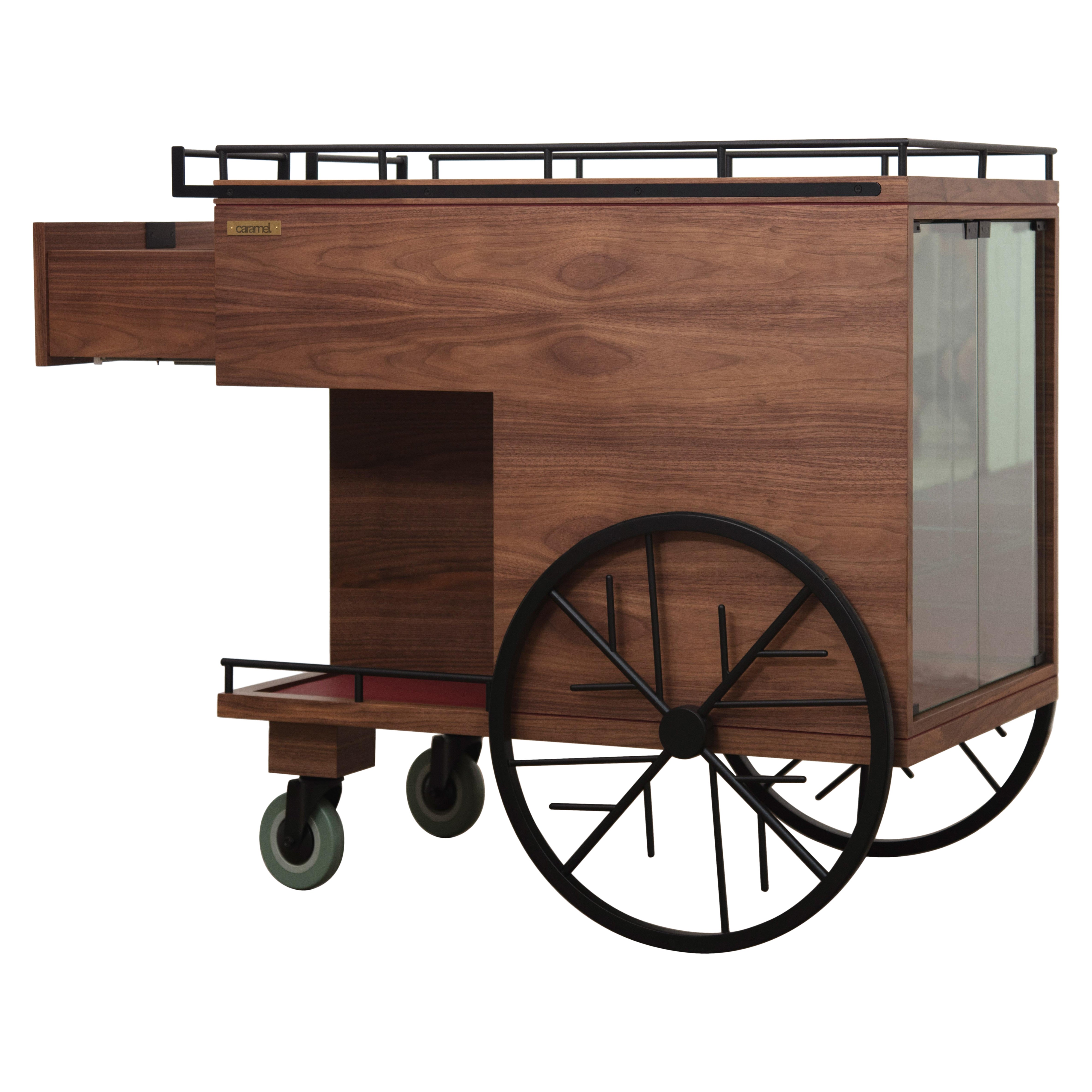 Chariot de bar en bois massif avec menuiserie découpée à la main, panneaux en verre trempé et accents métalliques fins. Fabriqué à la main à Los Angeles, Californie.