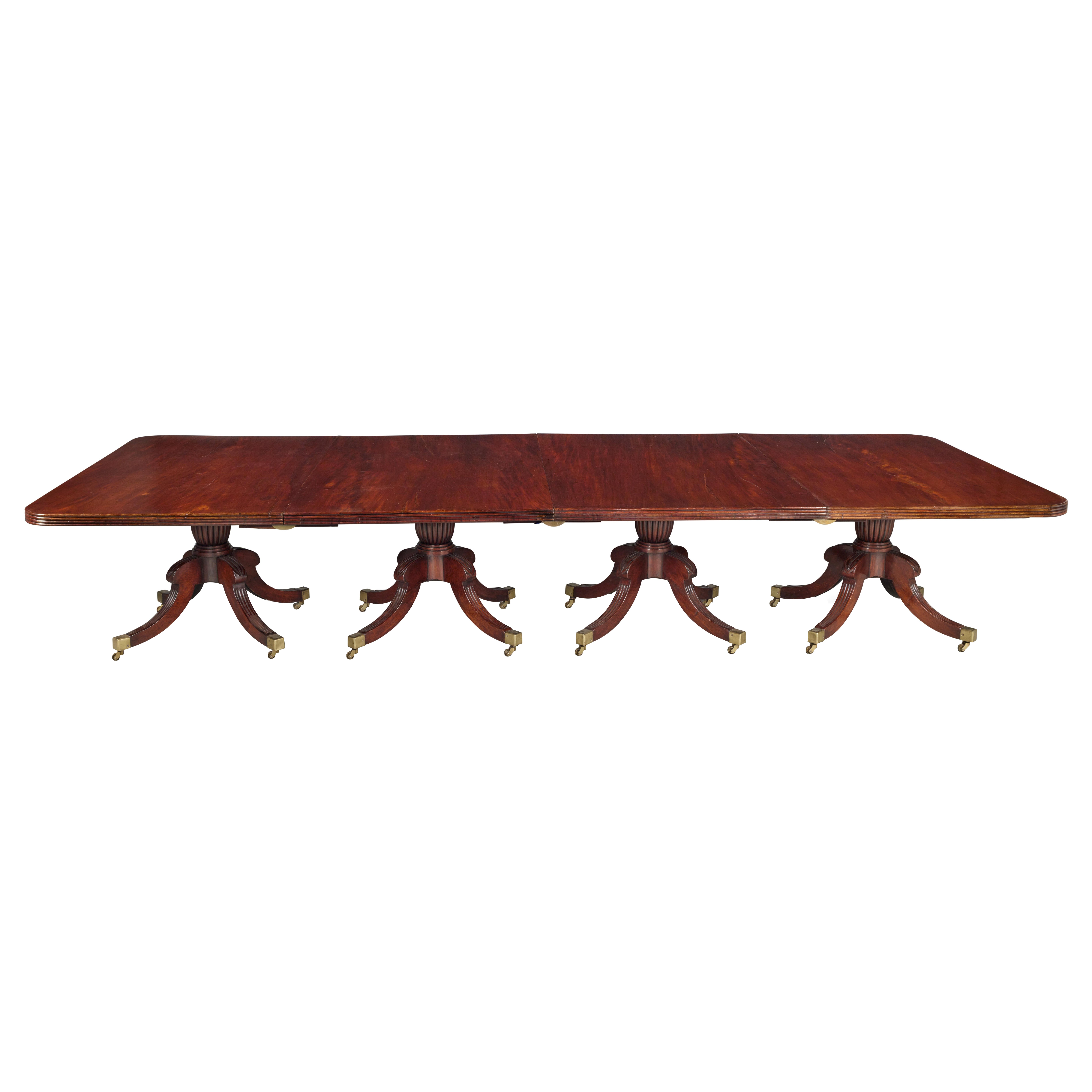 Rare table de salle à manger irlandaise 12/14 places en acajou figuré métamorphique antique victorien de superbe qualité avec un superbe plateau en acajou figuré de qualité avec une double moulure au pouce reposant sur huit pieds fuselés tournés avec des roulettes en laiton d'origine et un piédestal central attrayant et inhabituel avec quatre pieds cabriole façonnés avec des pieds en volute. Cette table permet également de réaliser une paire de consoles, une paire de tables de petit-déjeuner et une table de salle à manger 8 places. Dimensions : Hauteur 77 cm (30.31 in) Largeur 280 cm (110.24 in) Profondeur 142 cm (55.90 in) Hauteur sous la frise 61 cm (24.01 in) Hauteur au dessous de la section sans frise 72 cm (28.35 in) Sans panneau supplémentaire 77 cm x 142 x 142 cm (30.31 in x 55.90 in x 55.90 in) Profondeur de chaque console 70...