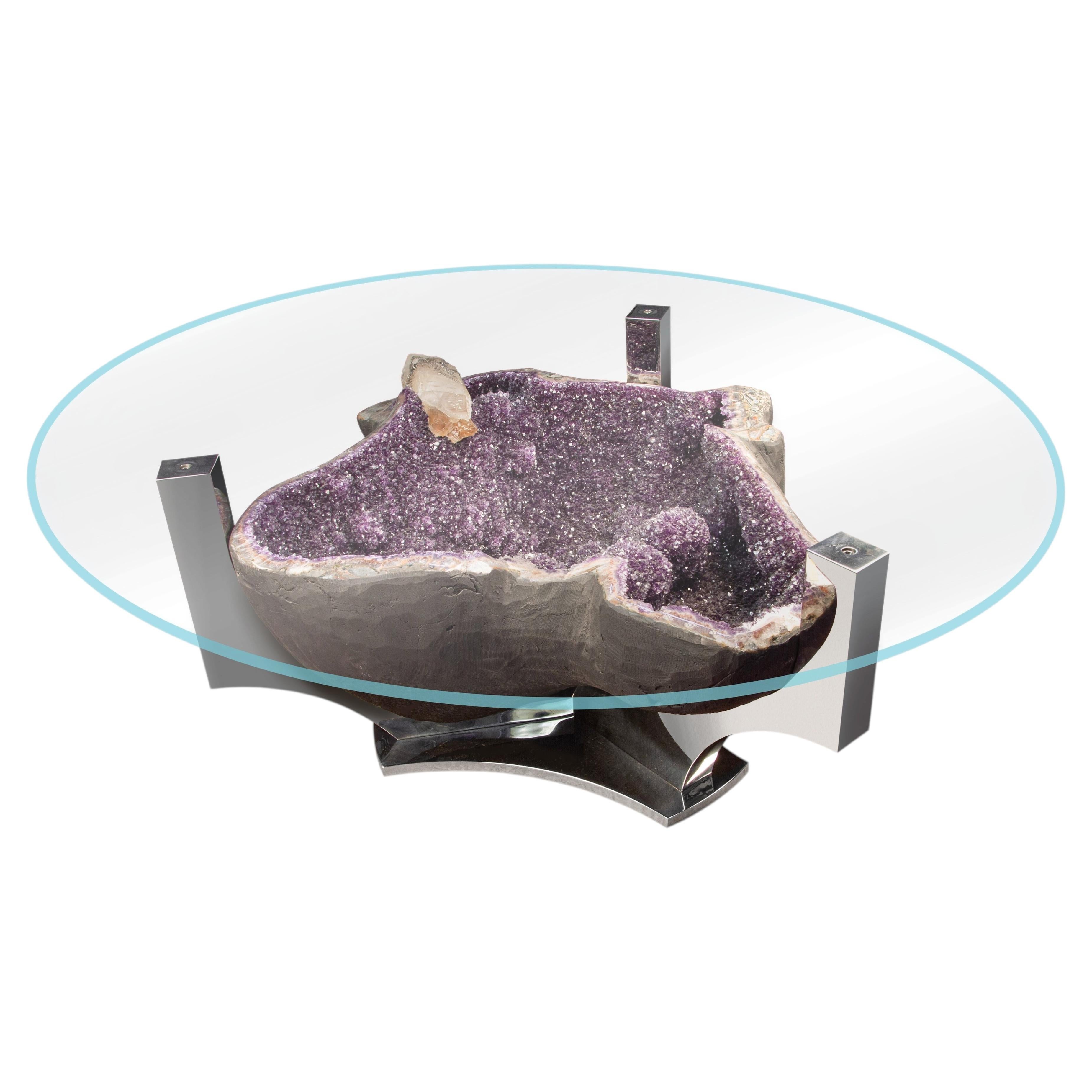 Cette table basse en géode d'améthyste de Stefano Piccini allie un design italien sculptural à la beauté brute de la formation naturelle des cristaux. Une géode d'améthyste richement...