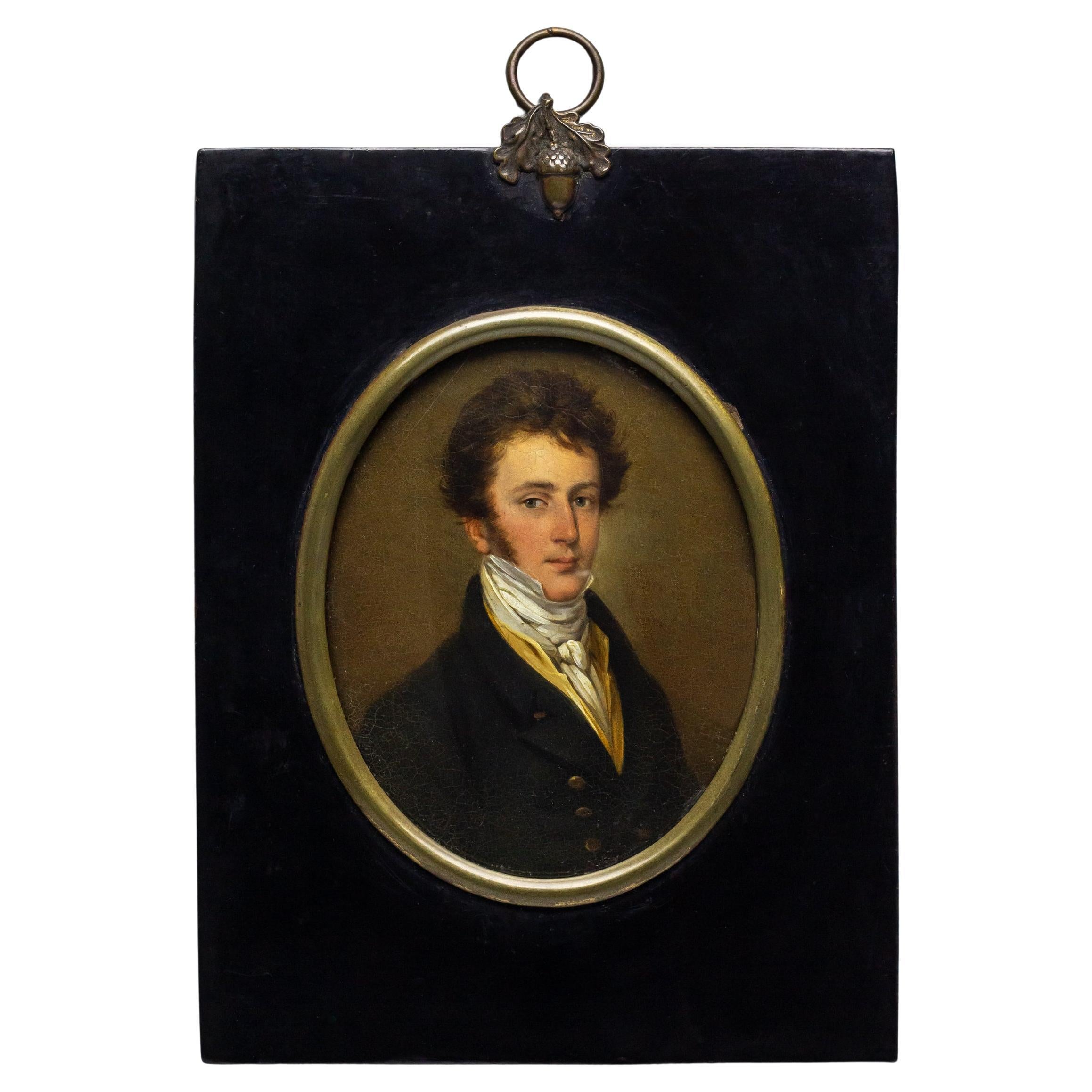 Ce portrait miniature plutôt charmant date du début du XIXe siècle, sous le règne de George III. La miniature à l'huile sur cuivre est placée dans un cadre en bois ébonisé et est ent...