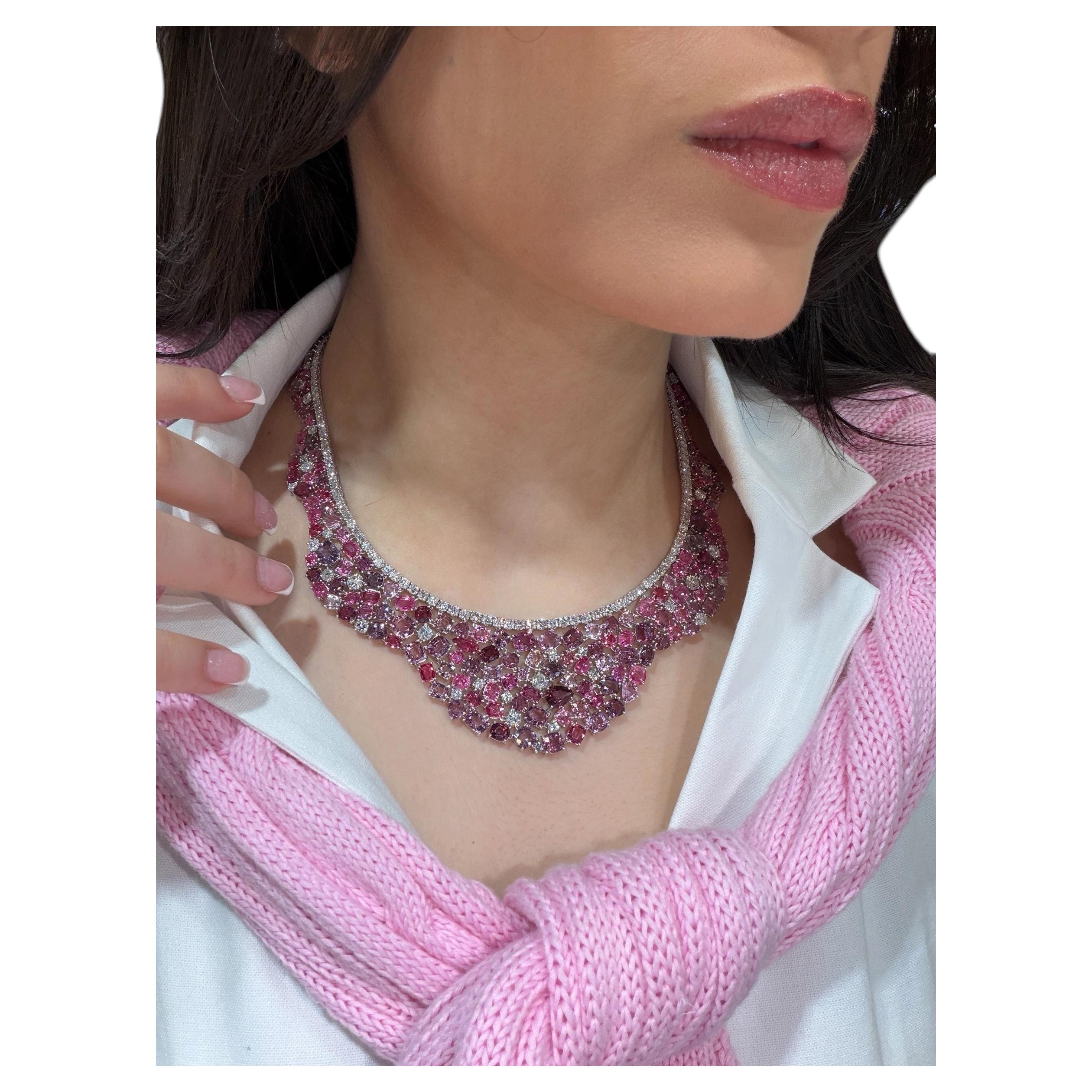 Une sublime broche rétro inspirée du travail des grands joailliers et de l'inspiration indienne que l'on retrouve dans les bijoux Tutti Frutti des années 1930. Il représente un panier ajouré et ciselé tenant un bouquet de fleurs et de branches. Serti d'une multitude de pierres précieuses et de diamants. On y trouve des tourmalines vertes, des saphirs, des grenats roses et orange, des rubis, des diamants de différentes tailles, des citrines et même un zircon jaune naturel au centre. Le fermoir est une épingle de sûreté.