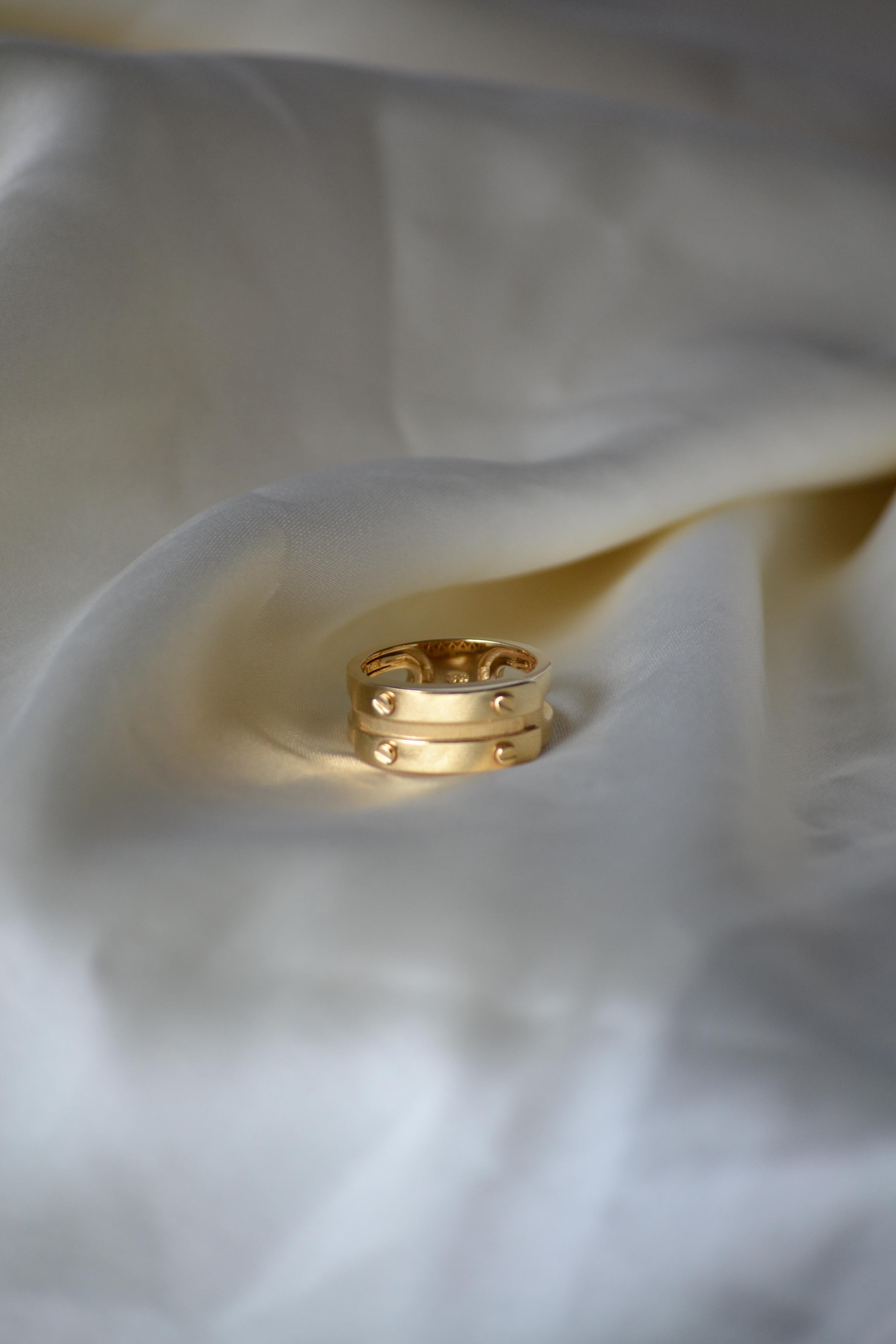 Expression audacieuse du luxe moderne, cette bague en or jaune 18 carats est synonyme de force et de sophistication. Fabriqué à la main au Brésil, son épaisseur de 9 mm lui confère un aspect à la fois substantiel et raffiné, tandis que l'or poli et élégant est rehaussé de détails vissés distinctifs pour une esthétique d'inspiration industrielle.