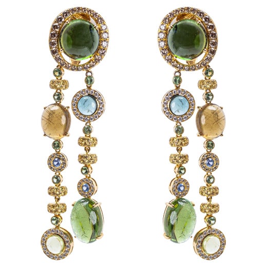 Boucles d'oreilles en or jaune 18 carats, saphirs multicolores, péridots, aigues-marines et diamants