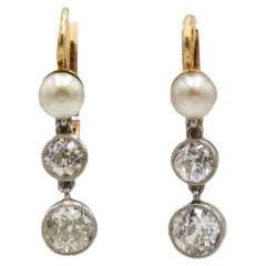 Elegant late-19th / early-20th century inspired drop earrings crafted in 18K rose gold (marked 750). Each earring features a delicate pearl at the top with two graduated old-cut diam...