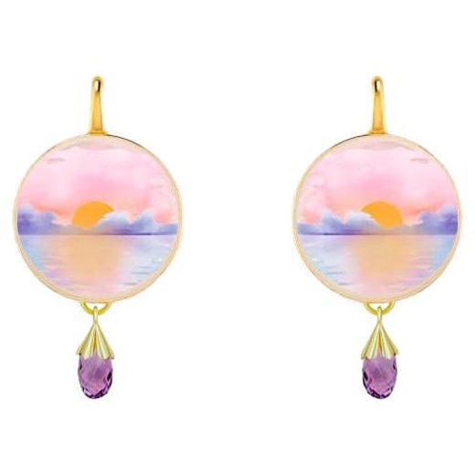 Ces magnifiques boucles d'oreilles présentent un ensemble unique d'art miniature peint à la main. Moulées en or 18 carats, ces boucles d'oreilles sont serties de 8,5 carats de grenat...