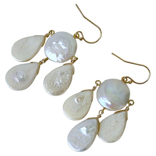 Boucles d'oreilles baroques Cabs ovales en or jaune 14 carats et perles blanches en forme de bouton