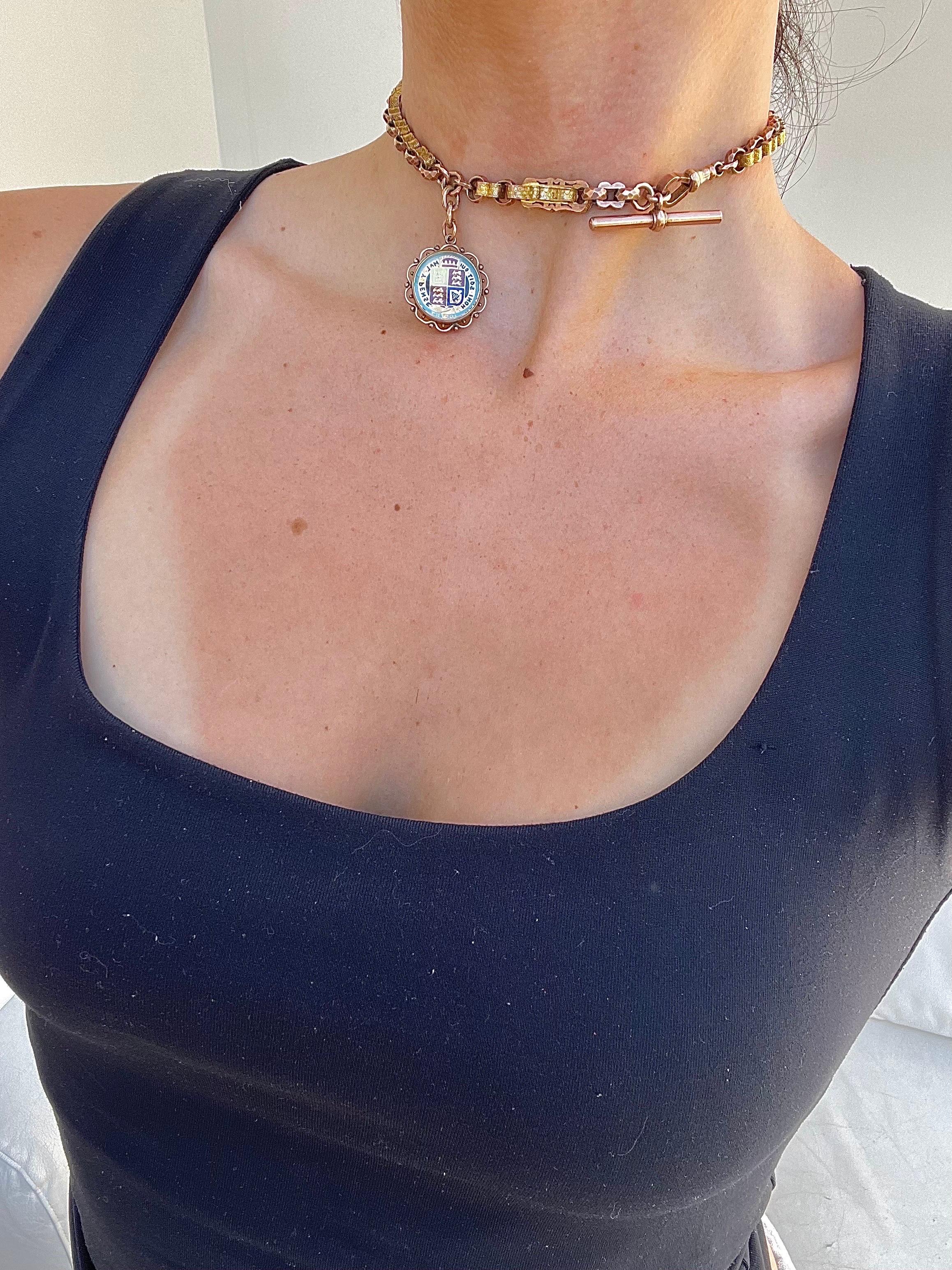 Circa l'époque victorienne, cette chaîne en or 14k se compose d'une alternance de longs maillons rectangulaires et d'une série de maillons entravés. Le maillon rectangulaire est orné...