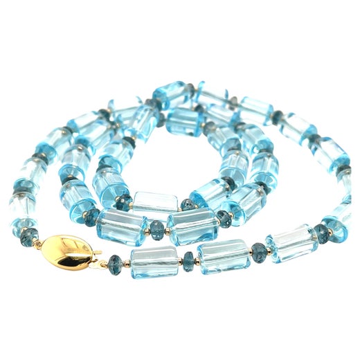 Ce collier polyvalent présente une belle collection de tourmalines naturelles dans la famille des bleus, des verts et des sarcelles. Les tourmalines semi-transparentes ont été facettées en colonnes à trois faces qui préservent la structure