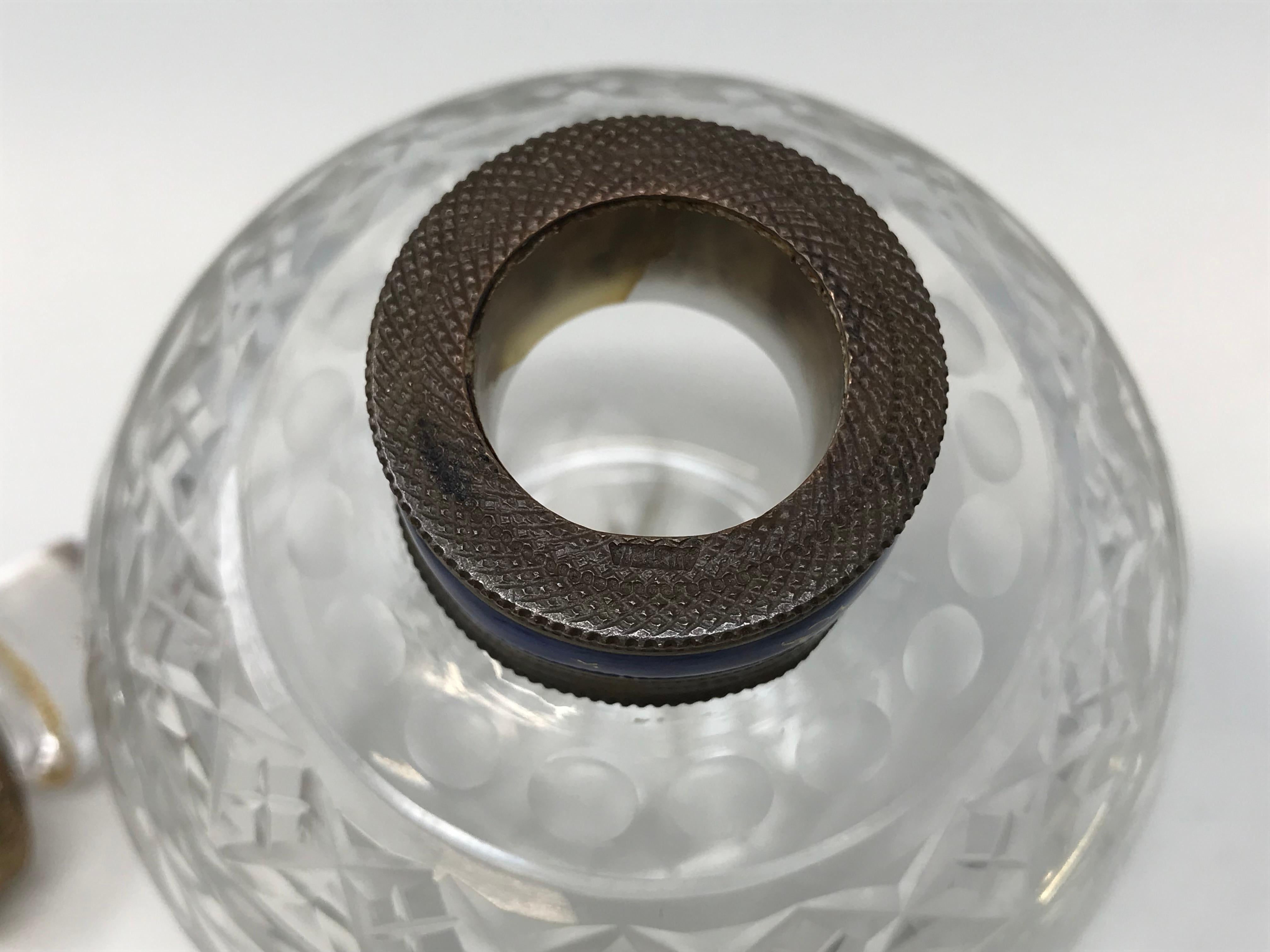 Bouteille de parfum victorienne en cristal taillé à la main avec col et bouchon en laiton et en émail, fin du 19e siècle, marque autrichienne, (marque visible mais peu claire). Mesure environ 4 1/4" de hauteur x 3 3/4" de diamètre, bon état ,bouteille en cristal clair.
