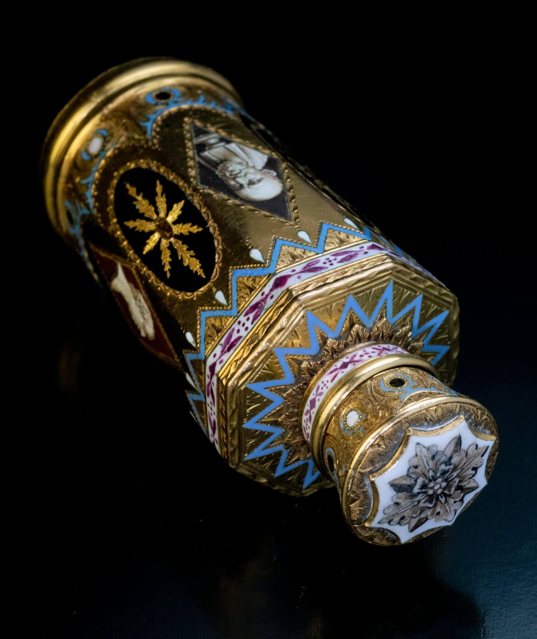 La très grande qualité de l'émail et du travail de l'or, ainsi que l'exceptionnelle peinture en grissaille des portraits miniatures, suggèrent que ce flacon à parfum a été commandé par un très riche mécène. La bouteille a également un poids en or important. Marqué sur le bouchon et près de la charnière d'une marque d'essai française postérieure en forme d'aigle.