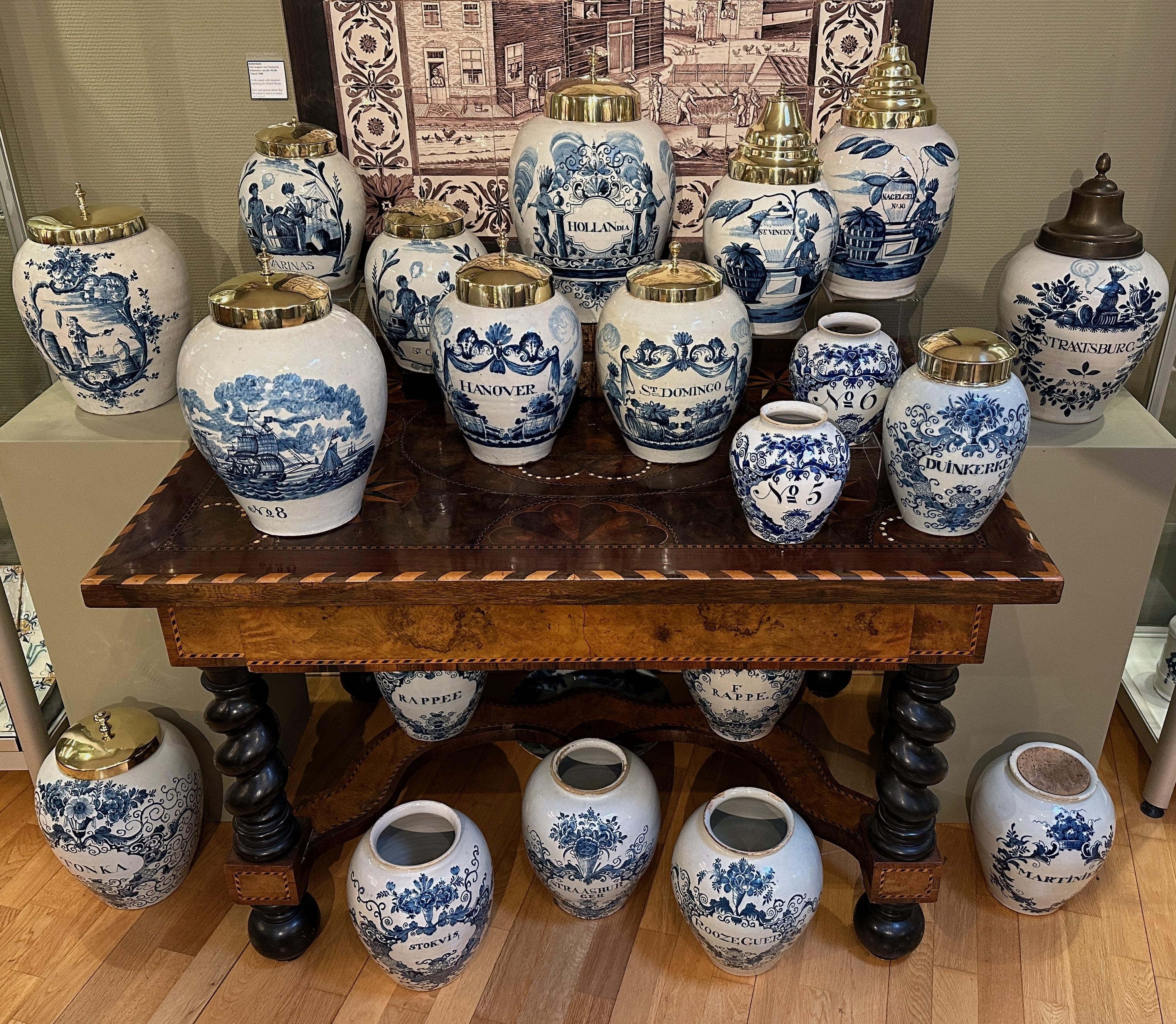 Au 18e siècle, le tabac est devenu partie intégrante de la vie sociale. D'abord appréciée aux XVIe et XVIIe siècles pour ses origines exotiques en tant que produit médicinal, elle a ensuite gagné en popularité en tant que stimulant. Le tabac était vendu dans des boutiques spécialisées où les commerçants le stockaient dans de grandes jarres néerlandaises en Delftware. Des pots plus petits étaient utilisés pour le tabac à priser (Rappe), étant donné que seules de petites quantités étaient nécessaires. Ces pots portaient souvent des inscriptions identifiant les mélanges spécifiques, tels que Kruidnagel (clou de girofle), Bergamote, Rozengeur (parfum de rose) et Violette. Ils ont également indiqué la région d'origine, y compris des lieux tels que La Havane, Macuba (Cuba), Martiniek (Martinique), Maryland, Portorico (Porto Rico), Virginie, Saint-Vincent, Saint-Omer, Baltimore, Duinkerken (Dunkerque), Eindhoven, etc. et des régions plus vastes telles que les États-Unis et la Hollande (Hollandia)
