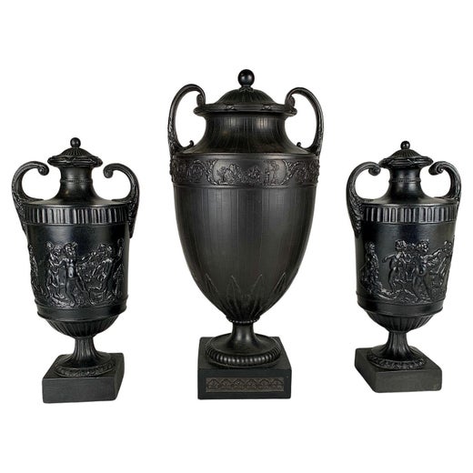 Wedgwood est célèbre pour ses Jasperware - moulés néoclassiques grès vases, assiettes et autres pièces inspirées de l'ancien verre camée, présentant des figures blanches, des scènes et des éléments décoratifs en relief sur un fond de couleur mate. La teinte de fond la plus connue est le bleu clair, mais les silhouettes emblématiques de Wedgwood apparaissent également sur des fonds verts, lilas, jaunes, noirs et même blancs. Certaines pièces anciennes de la vaisselle Wedgwood et d'autres présentent trois couleurs ou plus. L'entreprise est également connue pour son grès noir, Black Basalt, qui imite la couleur et les formes des vases étrusques.