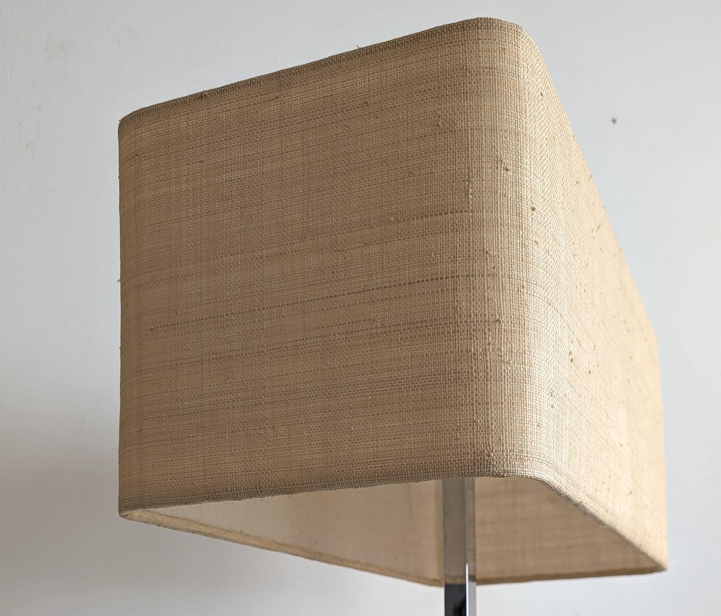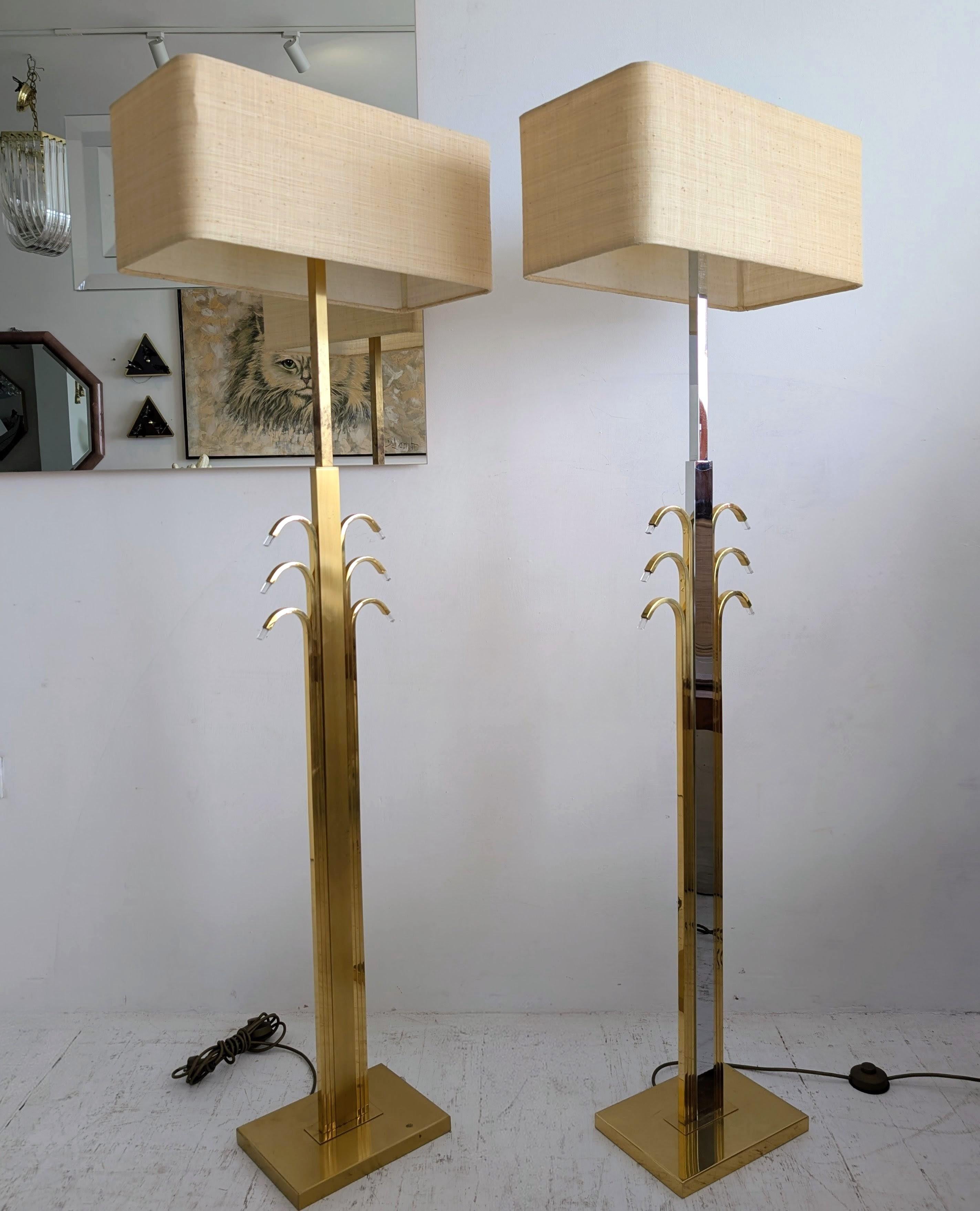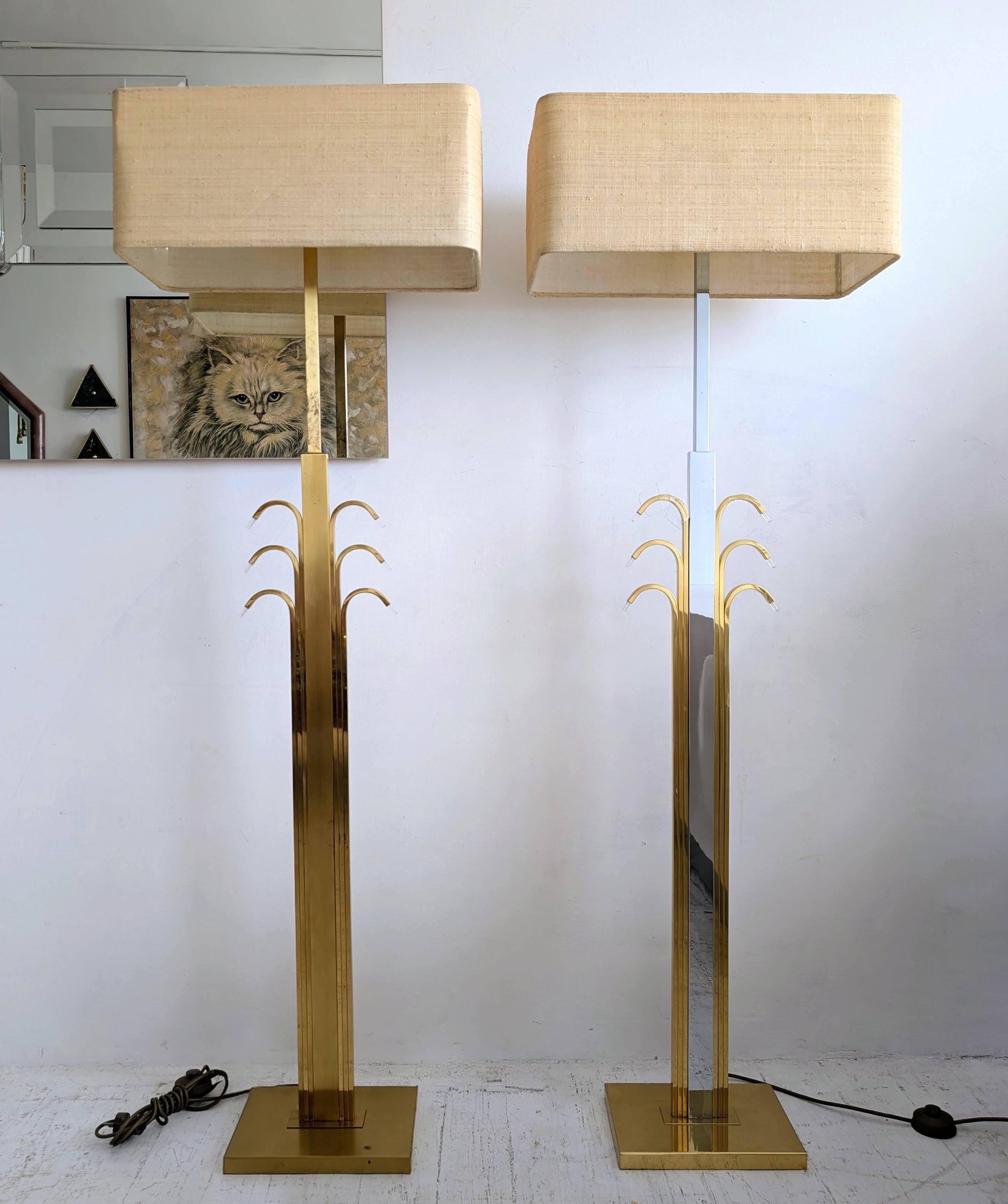 J'en ai deux : celui-ci est en laiton brossé et laiton brillant, l'autre - dans une liste séparée - est en chrome et laiton brillant. Les extrémités des frondes sont en Lucite. Complet avec de magnifiques abat-jour rectangulaires en toile de jute.