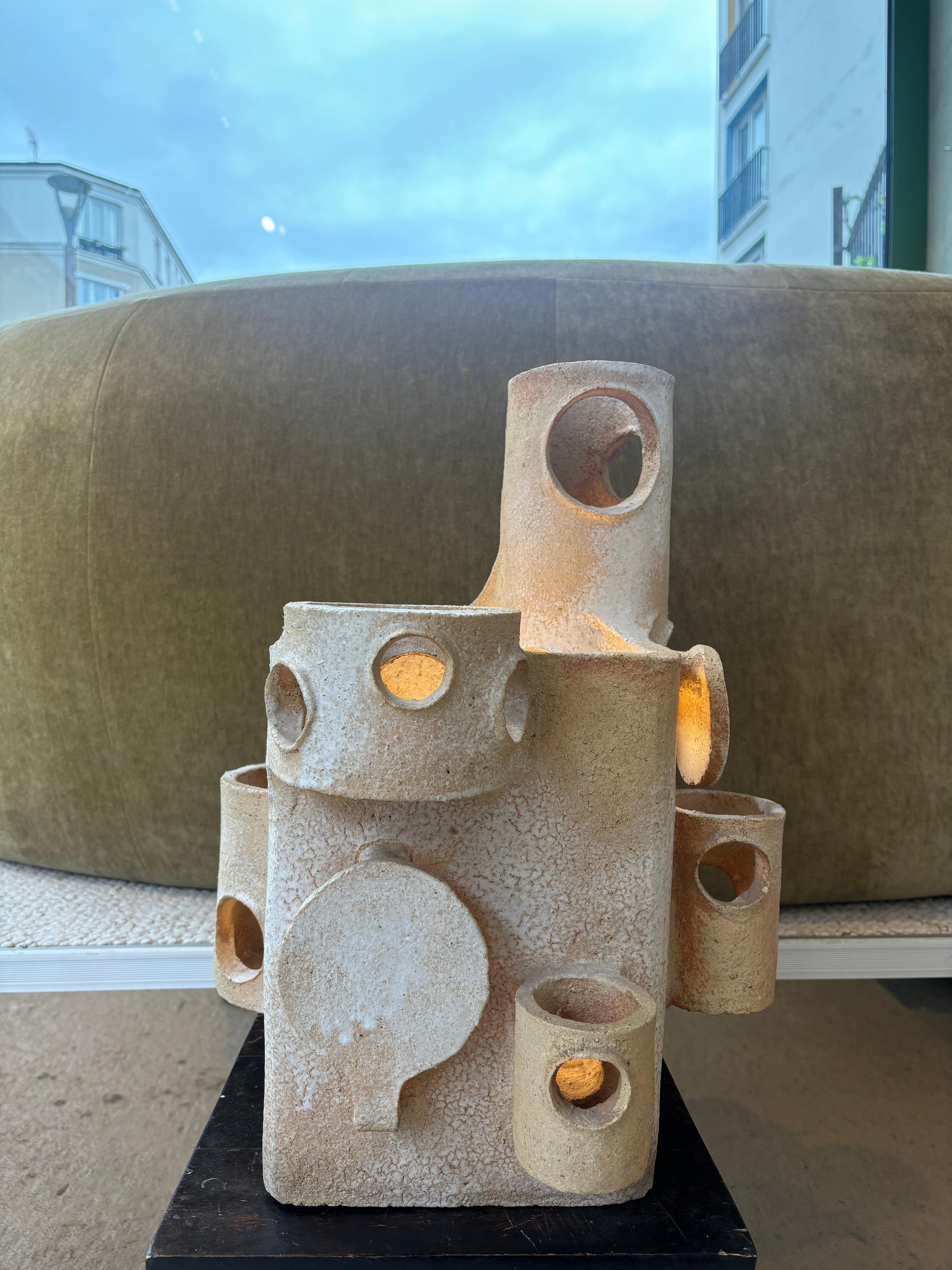 Cette lampe sculpturale de Cécile Dein se distingue par sa forme architecturale et sa matérialité brute. Réalisée en céramique, elle présente un corps c...