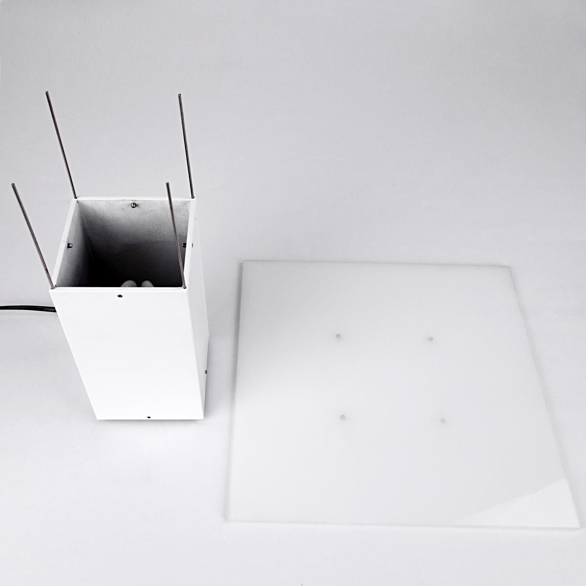 Lampe de table au design constructiviste / moderniste des années 1970 avec un corps en aluminium laqué blanc, l'abat-jour rectangulaire en acrylique produit une lumière douce grâce à...
