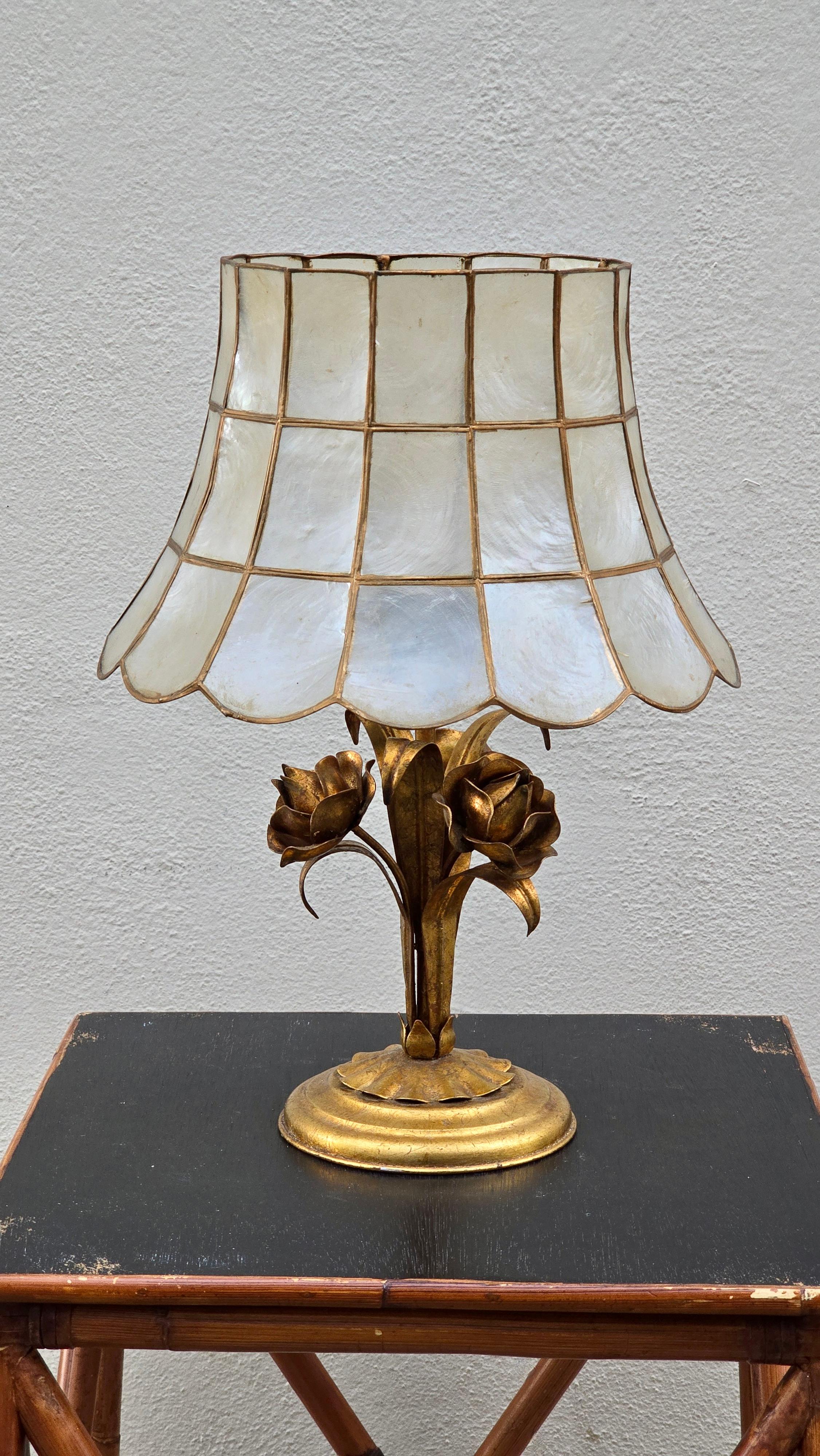 La lampe est dotée d'un socle en laiton orné d'élégantes fleurs roses et d'un abat-jour composé de magnifiques coquillages de Capiz.