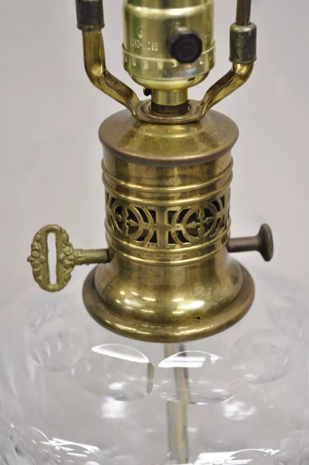 Lampe de table "lampe à huile" en cristal de verre, colonne en laiton, de style Empire. Circa Mid 20th Century. Dimensions : 37,5" H (jusqu'à l'embout) x 29" H (jusqu'à la douille) x...