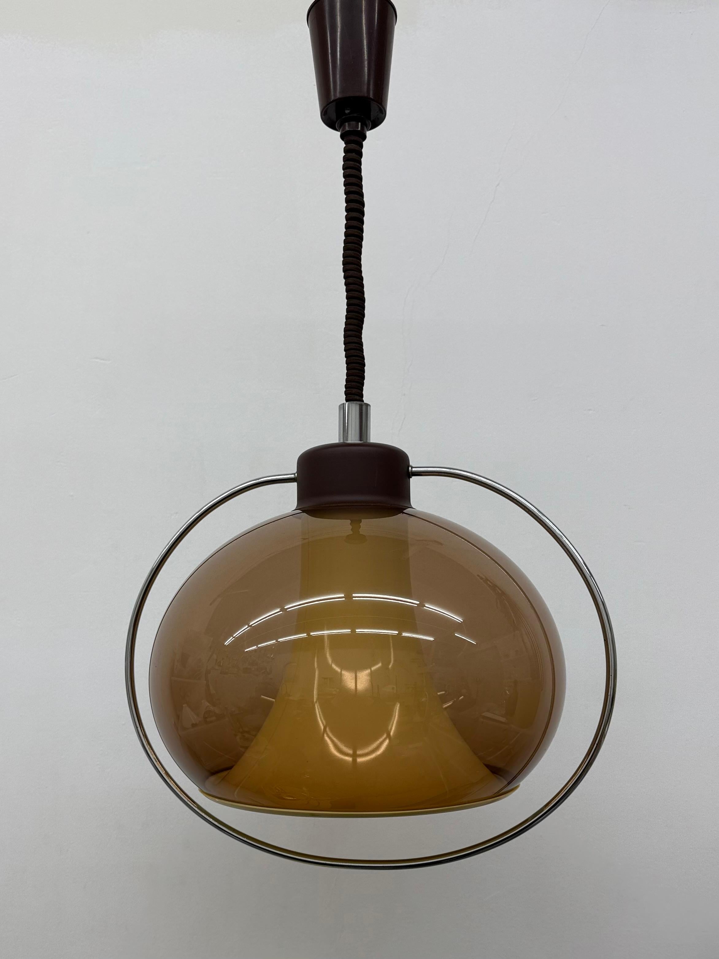 Lampe suspendue vintage par Emanuelle avec abat-jour en verre acrylique et cadre chromé. L'abat-jour produit une magnifique lumière chaude. La hauteur de la lampe peut être facilemen...