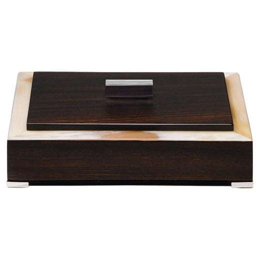Réalisée en ébène brillant, la glorieuse Isa Box comporte un plateau en laiton plaqué or 24k gravé à la main et est ornée d'inserts en corne biseautés. Mesurant 21 x 13 cm pour une h...