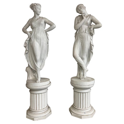 La surface de marbre présente un modelage raffiné avec des détails bien définis dans les cheveux, les couronnes florales et les plis superposés des robes. La texture de la peau est lisse et subtilement polie, tandis que les vêtements sont profondément sculptés pour suggérer la transparence du tissu. Chaque sculpture repose sur une base circulaire intégrale, soutenue par un socle cannelé classique de conception colonnaire, soulignant l'harmonie néoclassique des compositions. L'échelle grandeur nature de ces sculptures correspond étroitement aux dimensions des marbres originaux, ce qui illustre la précision et l'habileté de leur exécution. L'équilibre des proportions et la symétrie des figures témoignent du remarquable savoir-faire des artisans qui ont recréé les célèbres modèles de Canova.