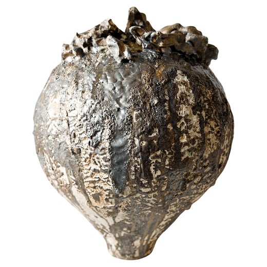 Ce vase unique en céramique présente une silhouette organique doucement arrondie, associée à une surface richement tactile, finie dans une glaçure cratérisée de tons terreux atténués...