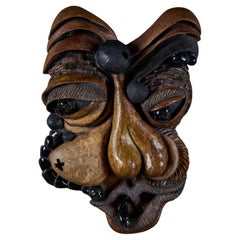 Suspension murale en bois sculpté d'A.I.C., c.1987. Cette œuvre d'art populaire peinte présente différents profils d'un homme barbu.