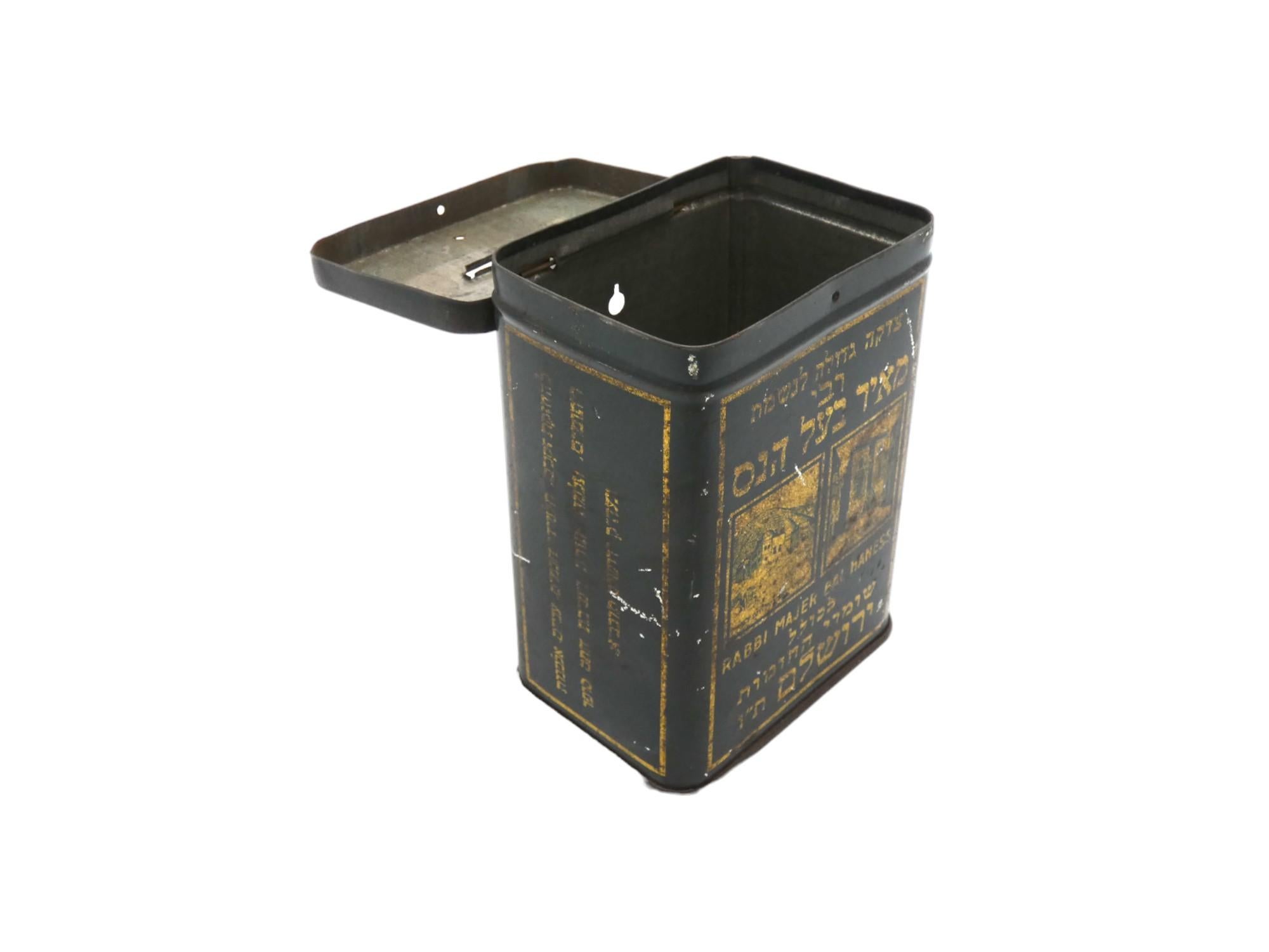 L'avant de la boîte est inscrit en hébreu et en allemand : "Rabbi Meir Baal Ha' Ness charity collecting funds for Shomrei Ha' Chomot Kolel" et décoré de deux images : la Yeshiva Hata...