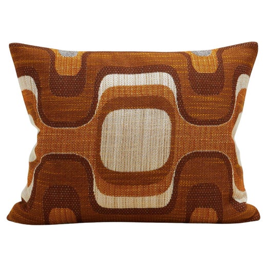 Coussin en lin ocre avec rectangles abstraits et dos en lin blanc.
