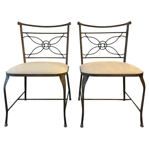 Ensemble de six chaises de salle à manger Art Déco Rene Prou en fer forgé avec sièges en tissu bleu