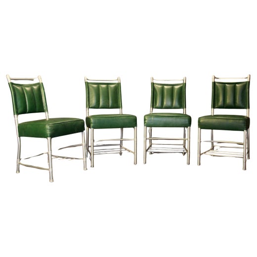 This set of six Art Deco / Machine Age folding chairs were designed by American designer Warren McArthur circa 1930s manufactured by Mayfair Industries. Each chair features its signature tubular aluminum frame with it’s original black vinyl upholstery on the back, seat, and armrests. They are comfortable and don’t feel like folding chairs when sitting in them. They retain their original anodized aluminum finish which shows only light use. They also retain their Mayfair manufacturer's label to underside ‘Mayfair Industries Inc. Yonkers, New York. A Warren McArthur Product.