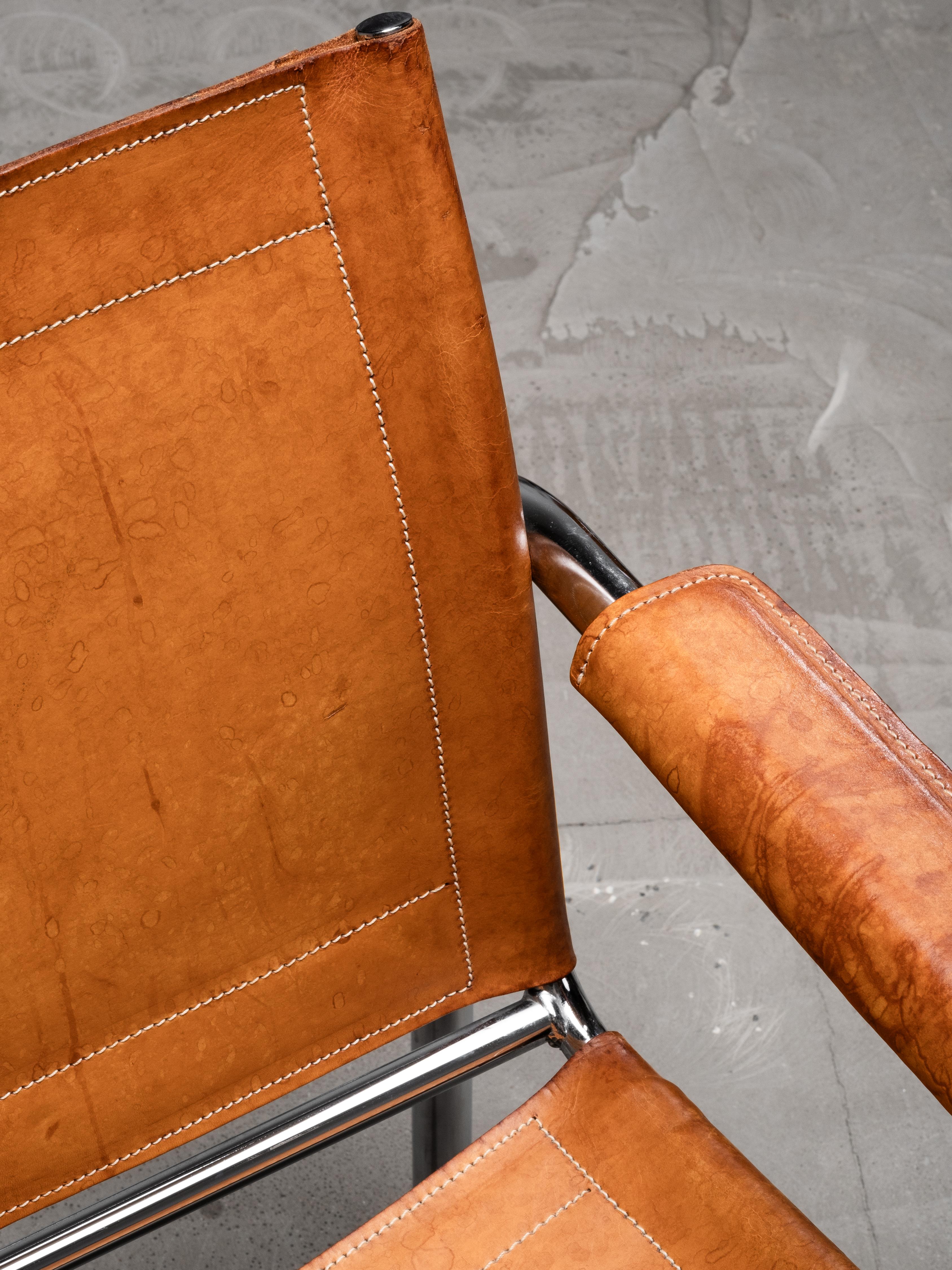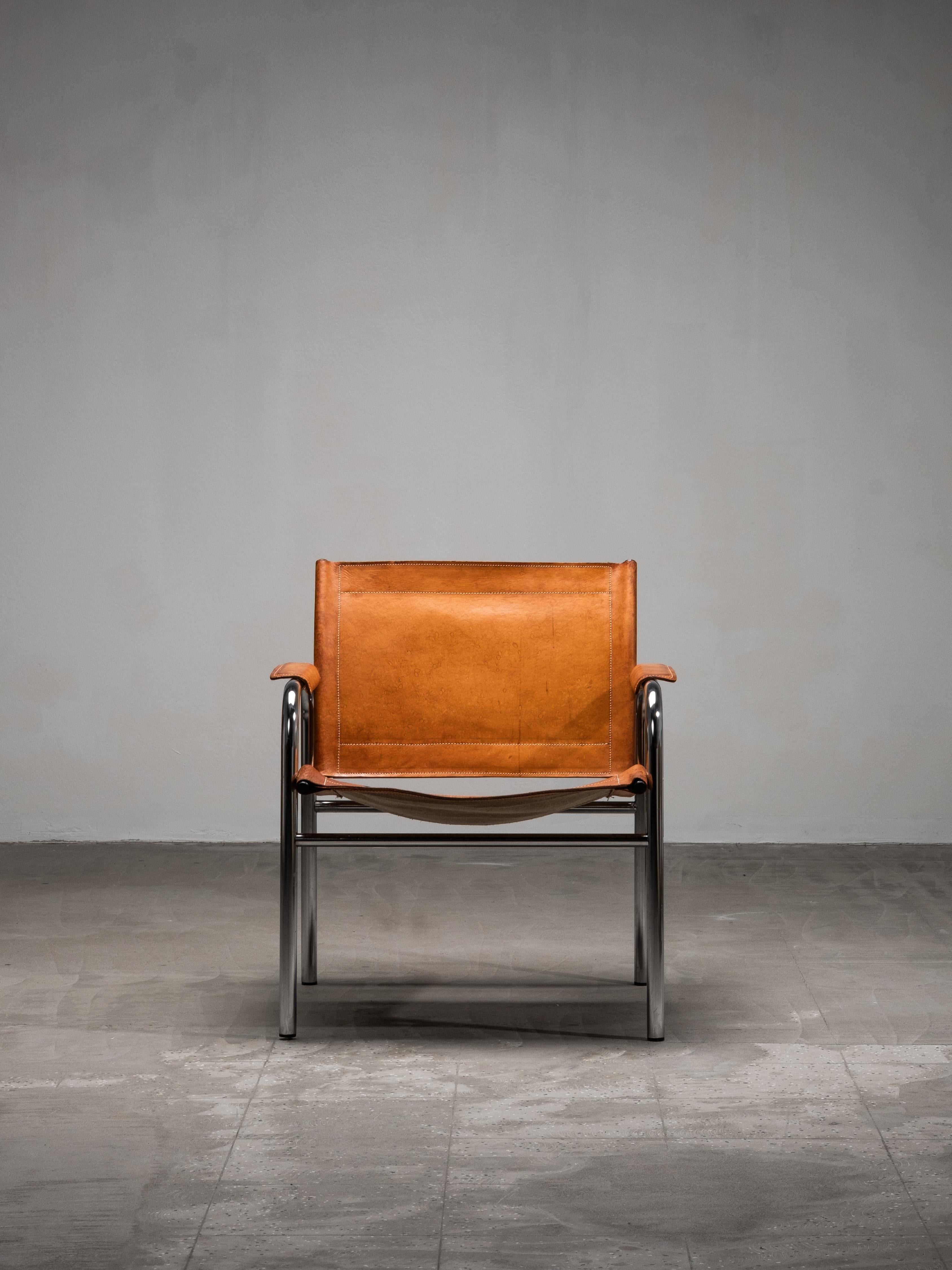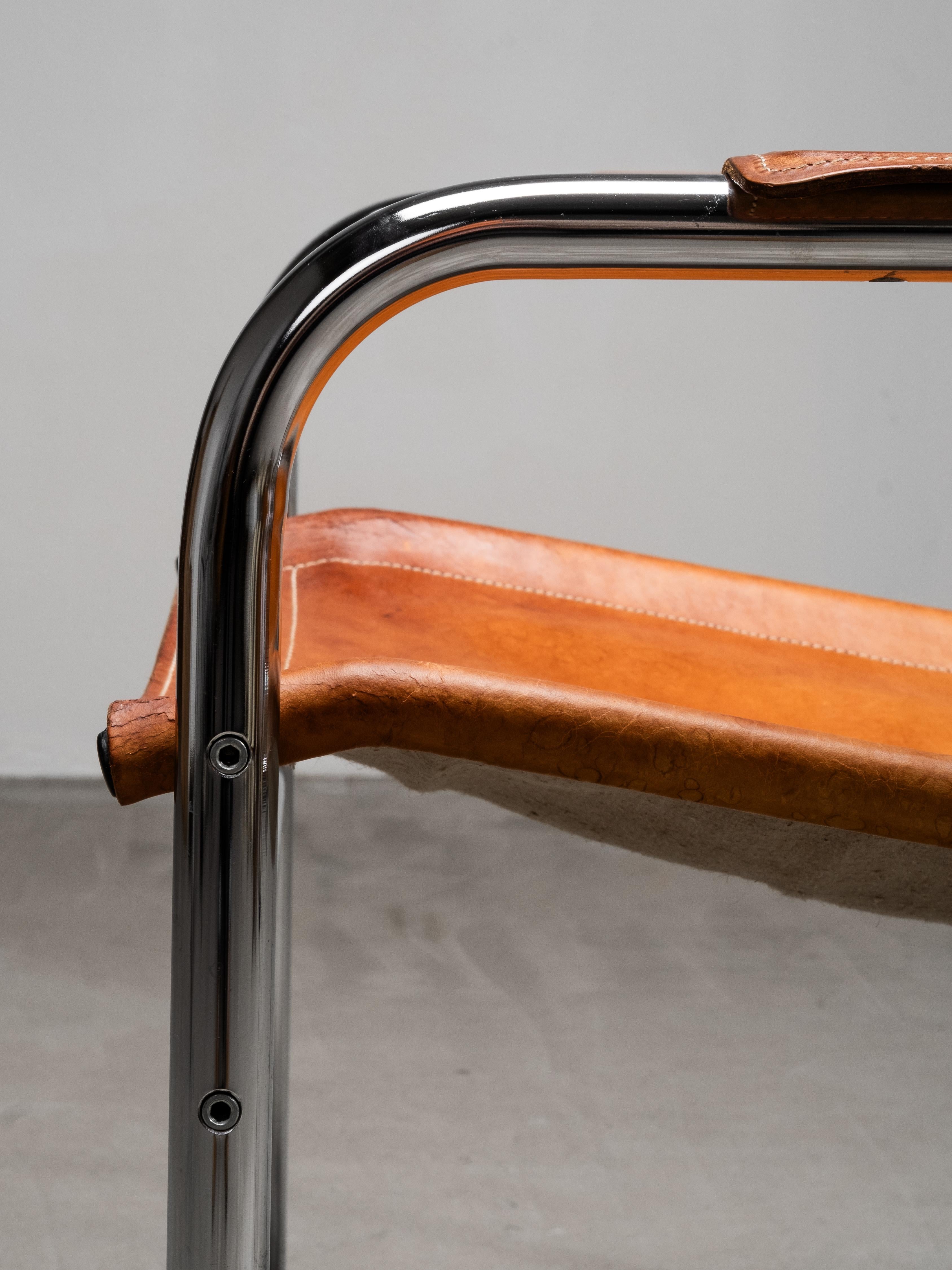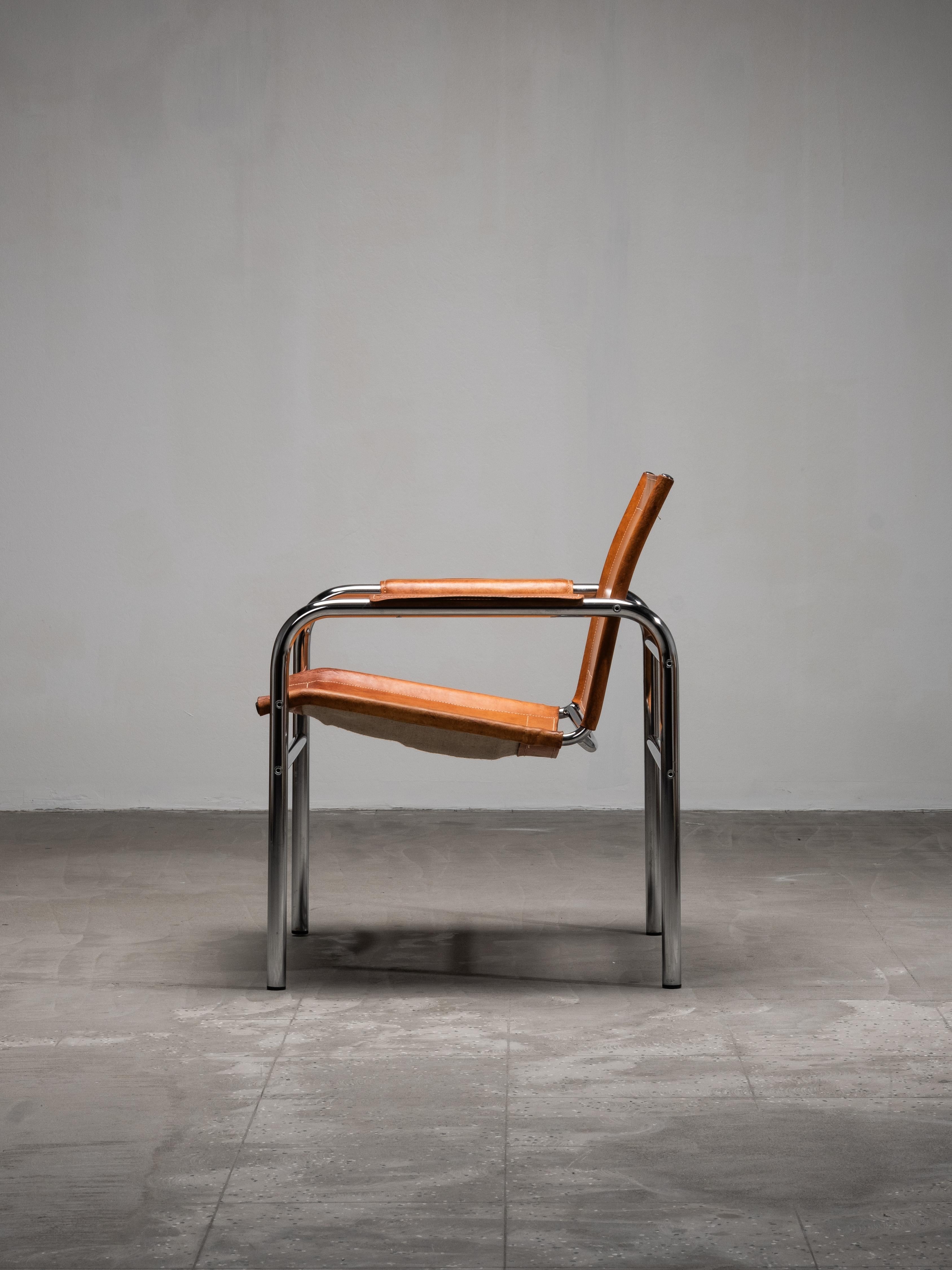 An original “Klinte” easy chair designed by Tord Björklund for IKEA in the 1980s. The chair features a tubular steel frame with a suspended seat and backrest in natural saddle leather. The armrests are wrapped in matching leather, softening the industrial structure with a warm, organic touch.