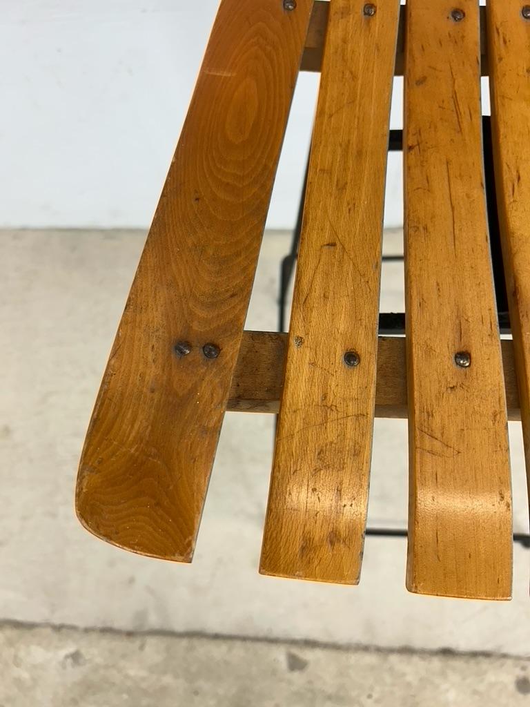 Ce tabouret industriel du milieu du siècle est doté d'une structure métallique unique, d'une assise en bois massif et d'un dossier en bois courbé réglable en hauteur.u2028u2028Chaise...
