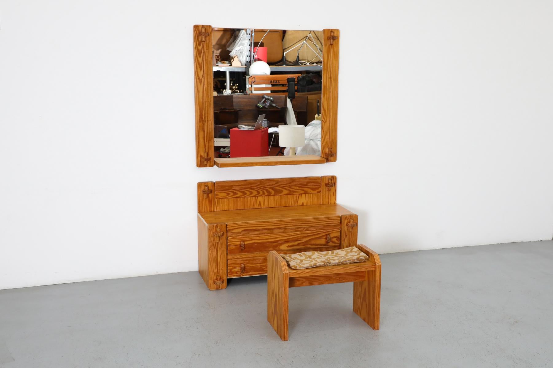 Ensemble de vanité en pin inspiré de Ate van Apeldoorn avec tiroirs, miroir mural et petit tabouret.