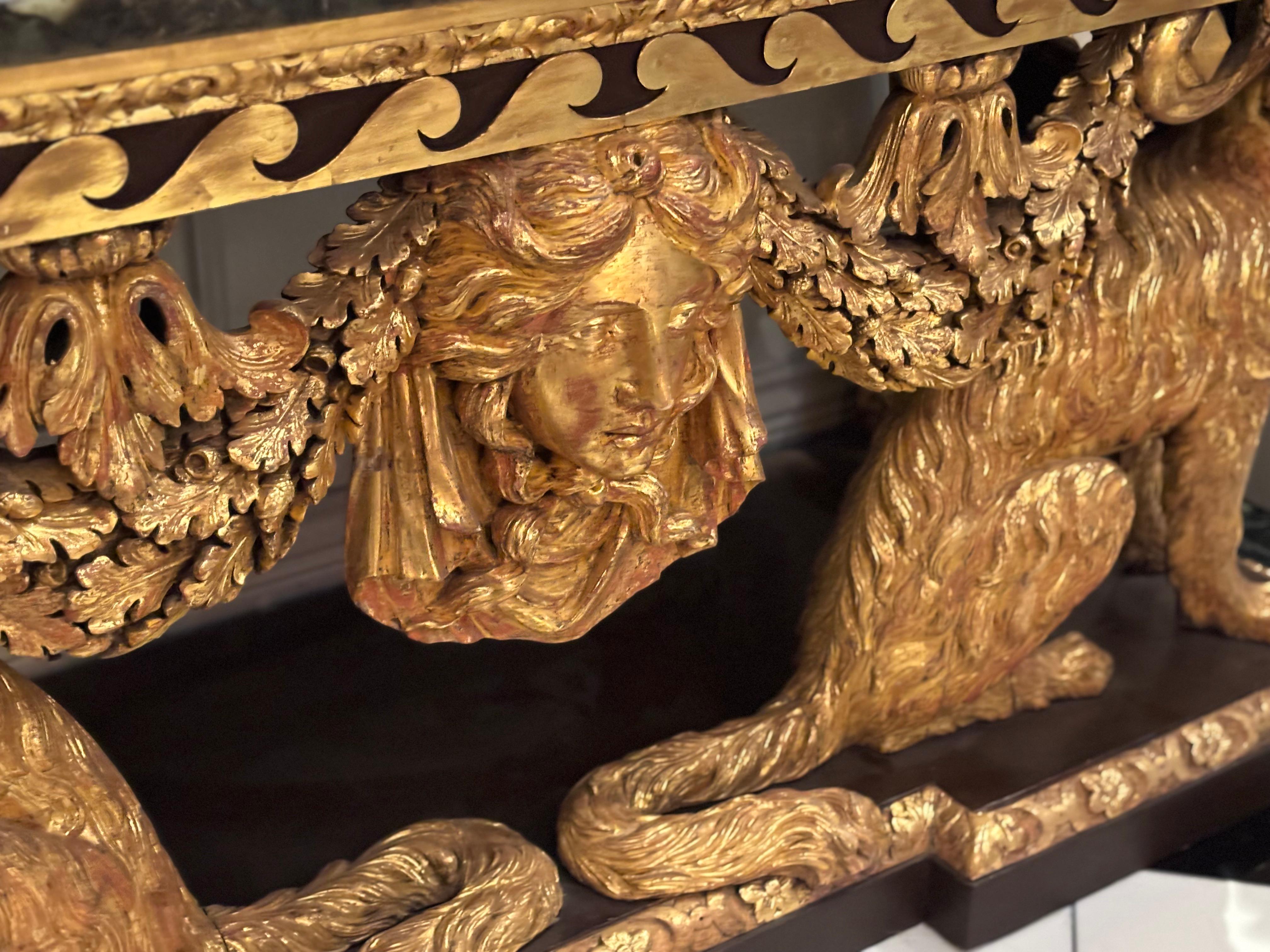 La console présente deux loups grandeur nature sculptés et dorés, assis de part et d'autre des coins avant et se regardant en arrière. La base de la console est peinte en brun foncé ressemblant à du bronze qui met en valeur la décoration en bois doré. Les deux têtes de loups soutiennent un tablier peint et doré décoré de scolls vitruviens. Deux guirlandes de glands dorés sont également suspendues et reliées à une grande tête d'Athéna classique drapée et dorée. Deux "pieds" arrière en forme de S, sculptés et dorés, relient la base au tablier. Un véritable tour de force de conception et d'exécution. Un plateau de marbre contemporain conforme en labradorite opalescente ajoute encore au caractère unique de la pièce.
