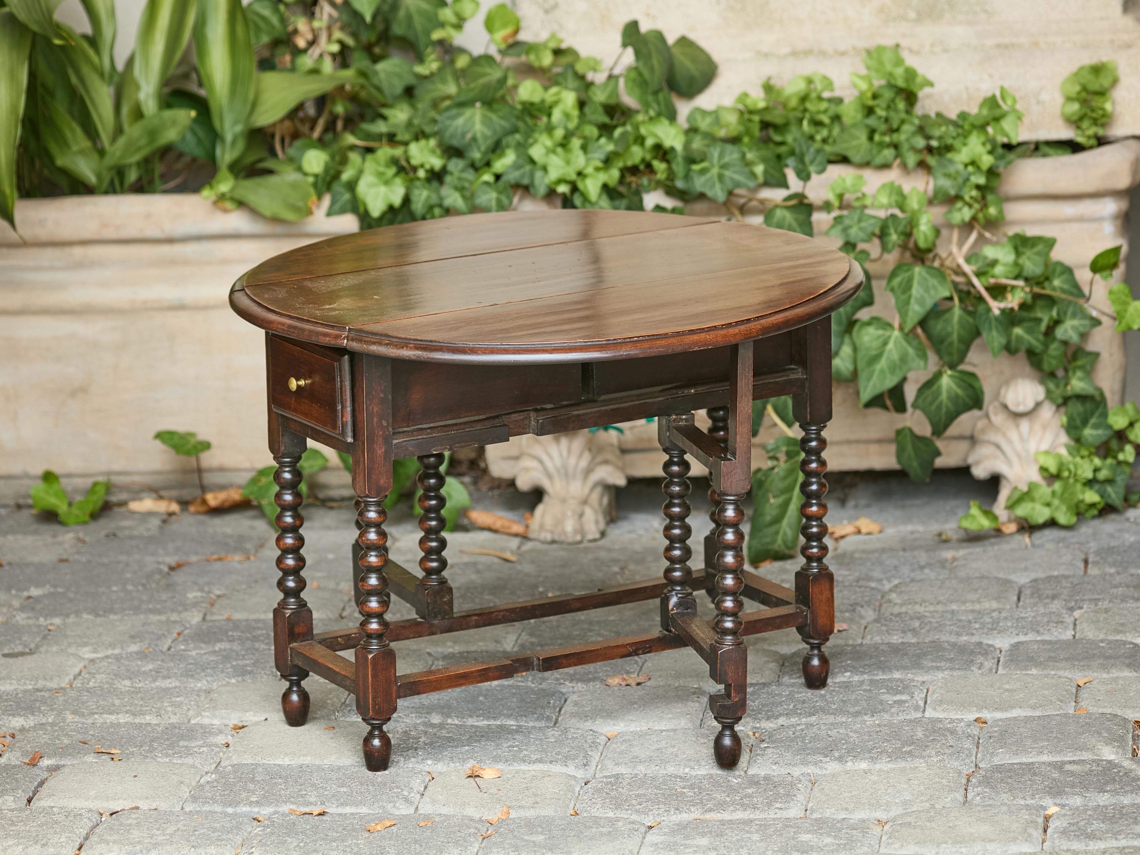 Table à abattants anglaise du 19ème siècle avec pieds tournés et deux tiroirs