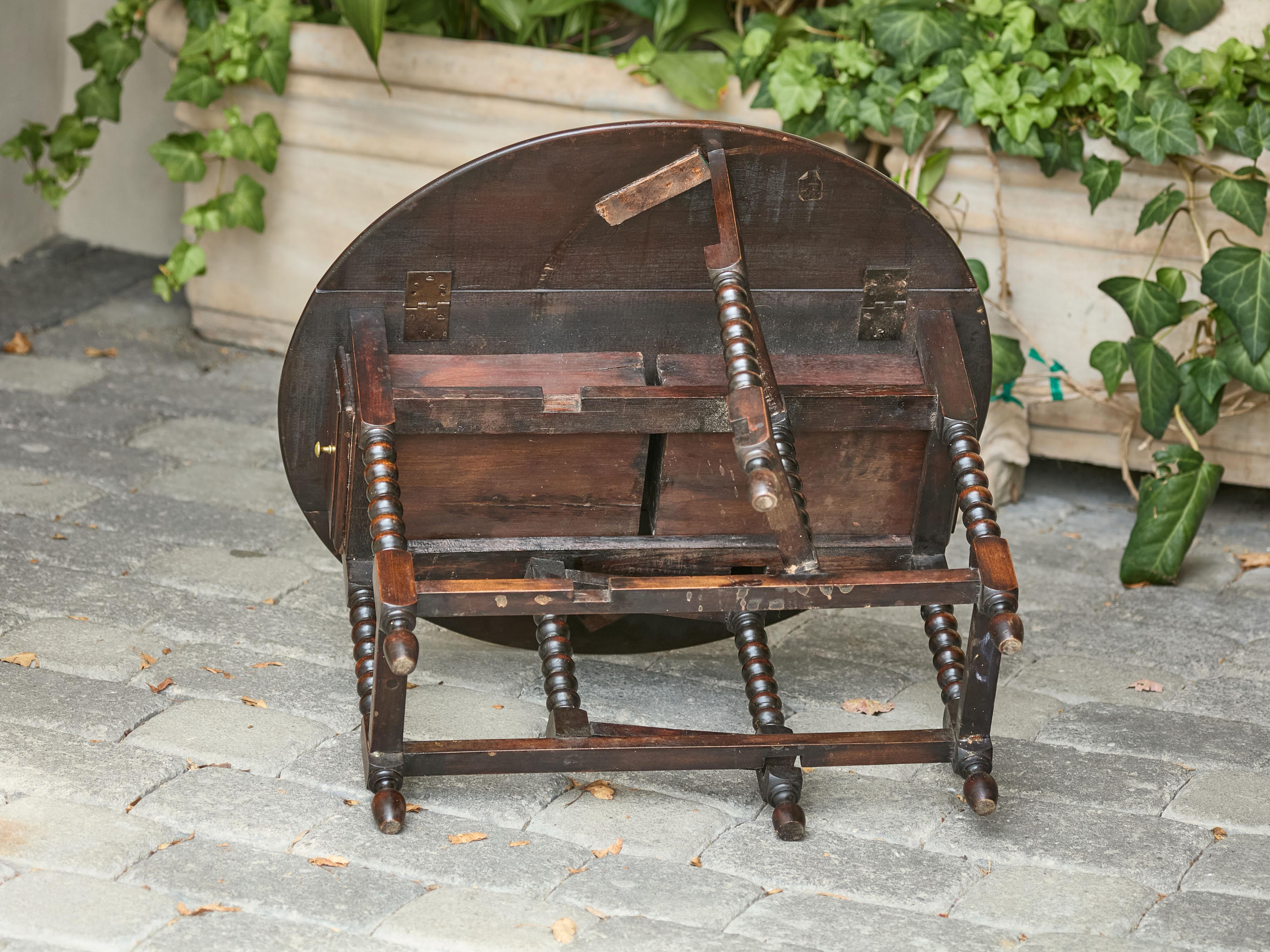 Table à abattant en chêne anglais, datant de 1920 environ, avec des pieds en forme de bobine et des tiroirs latéraux. Cette table à abattant en chêne anglais datant d'environ 1920 est une pièce charmante et fonctionnelle qui allie praticité et design classique. La table présente un plateau rond lorsque les feuilles sont déployées, mesurant 22,5" de diamètre, ce qui la rend idéale pour un espace d'exposition. Lorsque les Foldes sont repliés, le plateau de la table devient plus compact, avec une largeur de 22,5 pouces et une profondeur de 9 pouces, ce qui lui permet de s'adapter parfaitement à un mur ou à un espace plus restreint. La transformation est facilitée par les pieds pivotants, qui s'articulent pour soutenir les feuilles étendues en toute sécurité.