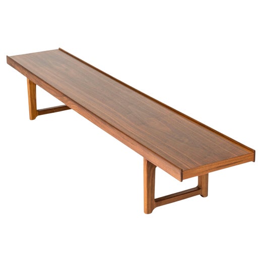 Banc ou table longue en palissandre norvégien, Design/One, Circa 1960, Krobo, Fabriqué en Norvège par Mellemstrands Trevareindustri. Le plateau rectangulaire avec une moulure extérie...