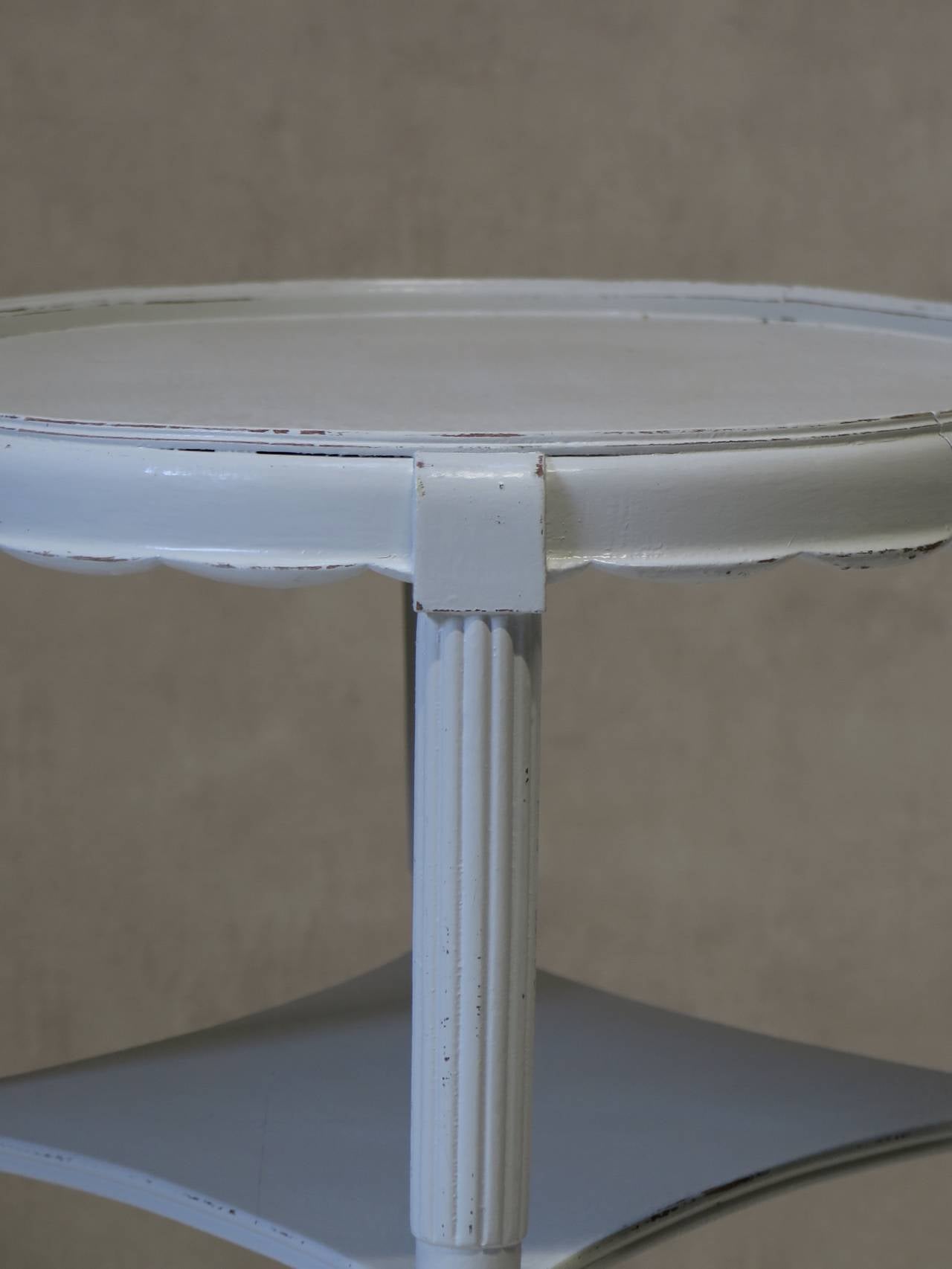 Table d'appoint française des années 1940, laquée crème, de forme élégante avec trois pieds courbes effilés.