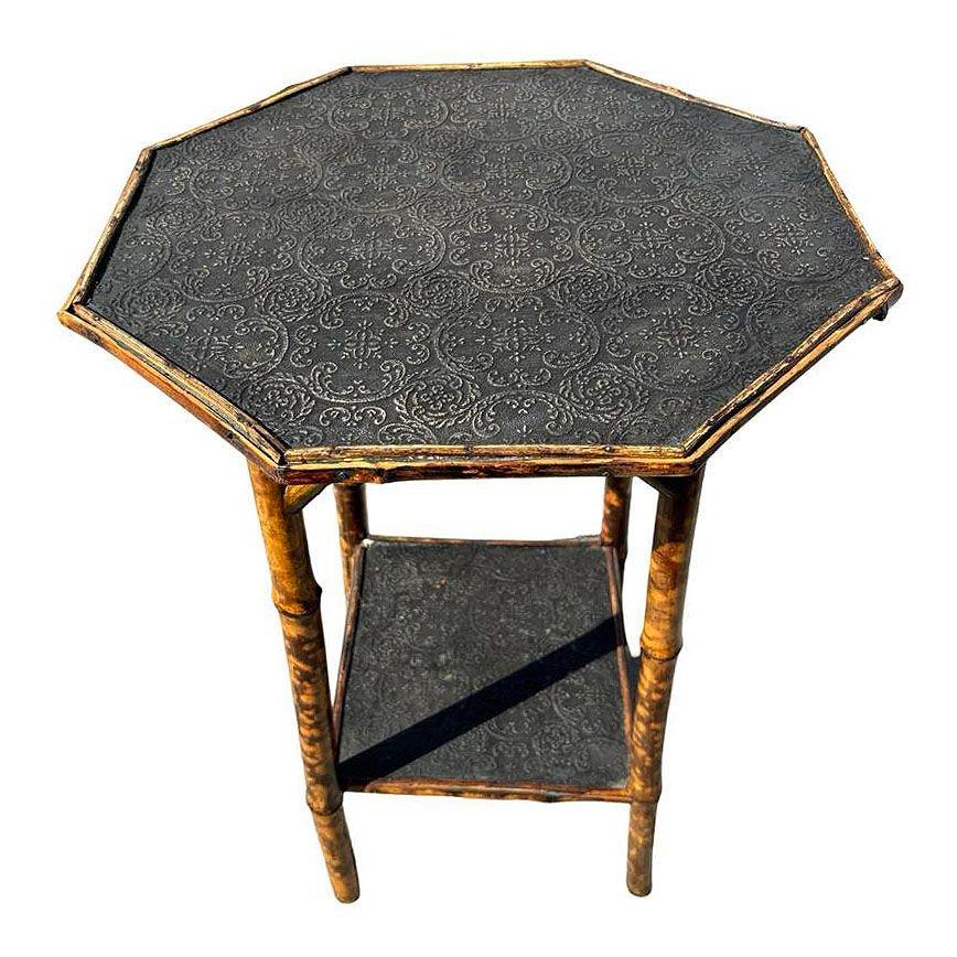 Table d'appoint en bambou tigré de la fin de l'époque victorienne, avec plateau octogonal à motif Paisley gaufré. La table se compose d'un cadre en bambou tigré et d'une étagère inférieure secondaire, généralement utilisée pour une plante en pot ou des livres. Les meubles en bambou de cette époque sont généralement associés au mouvement astétique de la fin des années 1800 et du début des années 1900.