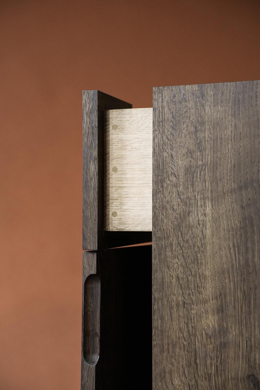 Le tiroir unique du haut est construit de manière traditionnelle et monté sur des glissières en bois de chêne naturel qui offrent un fabuleux contraste. Le détail de la tirette se retrouve également sur la porte de l'armoire située en dessous, qui se ferme grâce à un mécanisme magnétique très subtil.