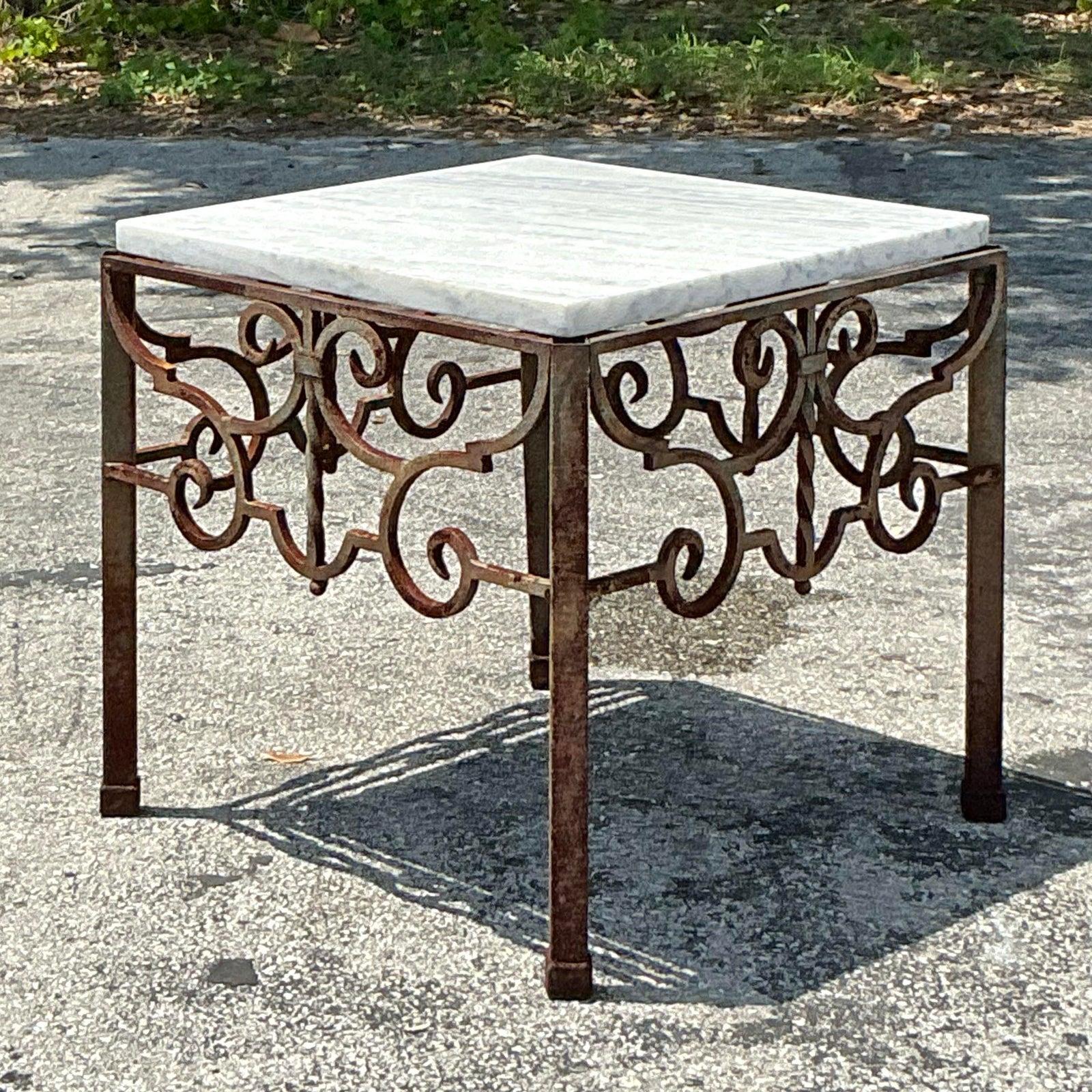 Cette table d'appoint vintage allie sans effort l'élégance rustique à un design intemporel. La base en fer forgé à la main présente des volutes complexes et une patine magnifiquement altérée, évoquant le charme du vieux monde et le travail artisanal. Surmontée d'une plaque de marbre adouci, la surface blanc crème ajoute un contraste raffiné à la ferronnerie vieillie de la table, ce qui en fait une pièce d'apparat dans n'importe quel espace.