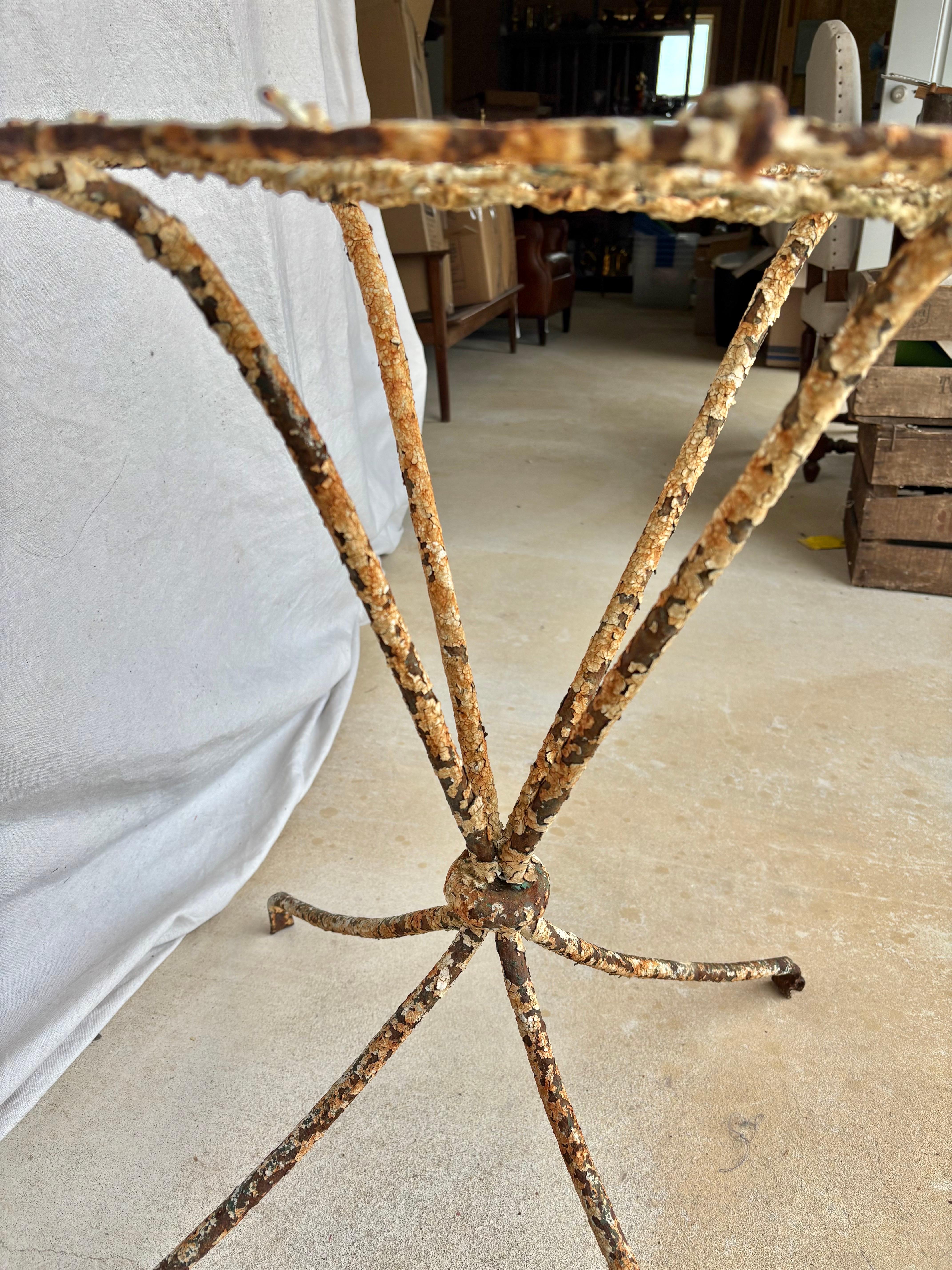 Table de jardin en fer de style campagnard français avec base à volutes et patine d'usage, années 1920