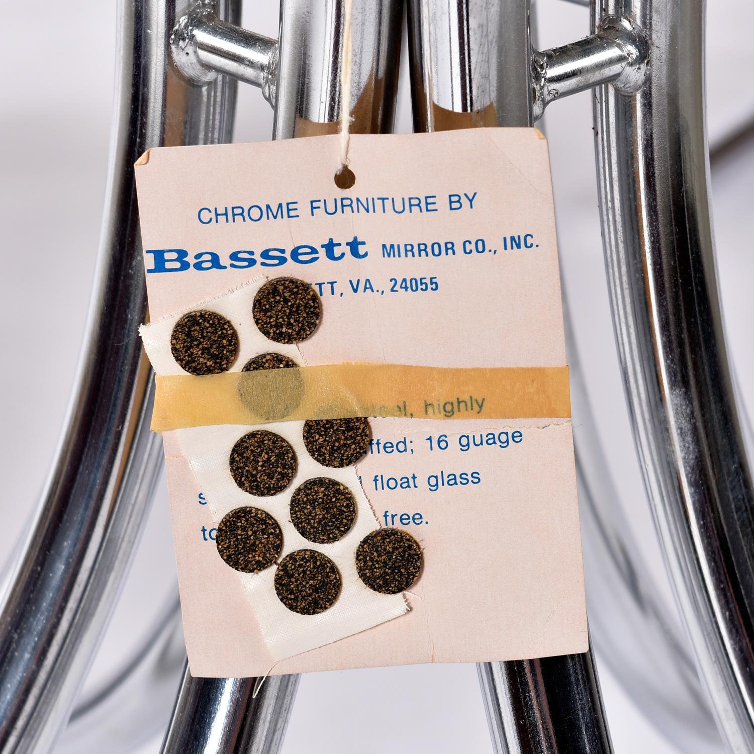 Nous avons le plaisir de vous présenter cet ensemble de salle à manger de luxe. Cette combinaison représente tout ce que nous aimons dans l'esthétique des années 1970 en un seul paquet ! Les chaises sont de Daystrom et la table de Bassett. Les deux sociétés nous ont apporté de fabuleux designs dans la période mid-mod, et ce mariage s'inscrit dans la droite ligne de cet héritage. Le glamour des années 70 rencontre la modernité futuriste dans cet ensemble de dînette à quatre places. La base de la table est fabriquée en acier tubulaire chromé courbé dans un style unique et captivant de piédestal en forme de lotus fleuri. L'hexagone en verre fumé est recouvert d'une couche d'étoffe qui s'ajoute aux reflets chromés polis à la main. Cette table légèrement utilisée a encore son étiquette d'origine et ses pare-chocs pour le verre.