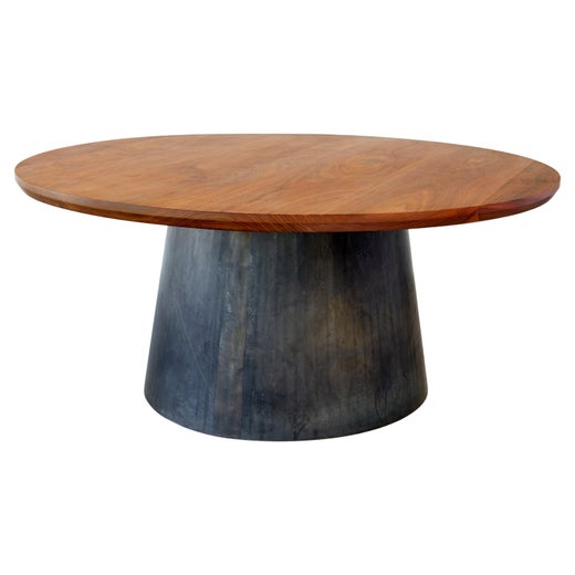 Une table de salle à manger ronde spectaculaire fabriquée à la main avec un plateau en noyer noir massif et une base sculpturale en acier noirci. La base conique en acier est méticul...