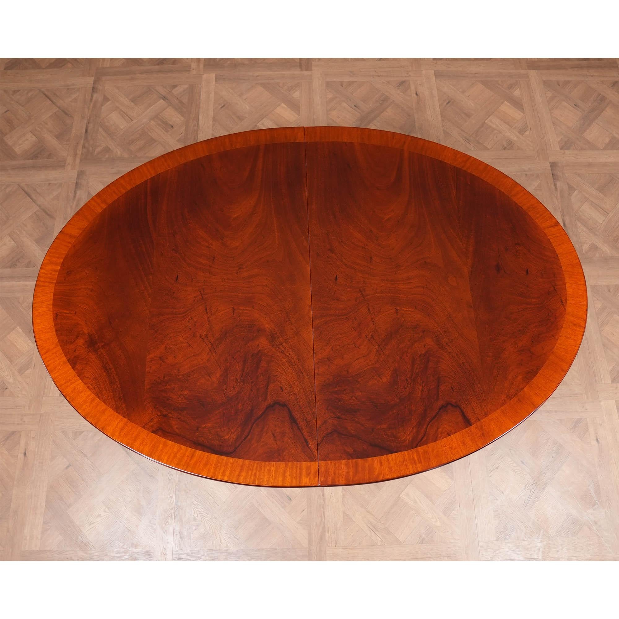 Table de salle à manger ovale en acajou. Une table idéale pour les espaces plus étroits. Les extrémités effilées de cette table de salle à manger permettent de se déplacer plus facilement autour de la table, même lorsque les invités sont assis. Lorsqu'elle est fermée, la longue table à manger ovale en acajou est plus petite que la plupart de nos tables à manger, mais elle peut tout de même accueillir six personnes sur des chaises de taille moyenne. Entièrement ouverte sur les rails métalliques de fabrication américaine et avec les trois rallonges de table en place, la table peut facilement accueillir dix personnes avec une chaise de taille moyenne, douze personnes avec une chaise de taille plus étroite. Elegant et sophistiqué, le plateau grainé, entouré de bandes en bois satiné et d'un bord entièrement cannelé, confère une sensation de luxe à toute salle à manger. Les piédestaux sont fabriqués à la main en acajou massif et se terminent par des pieds coiffés de laiton.