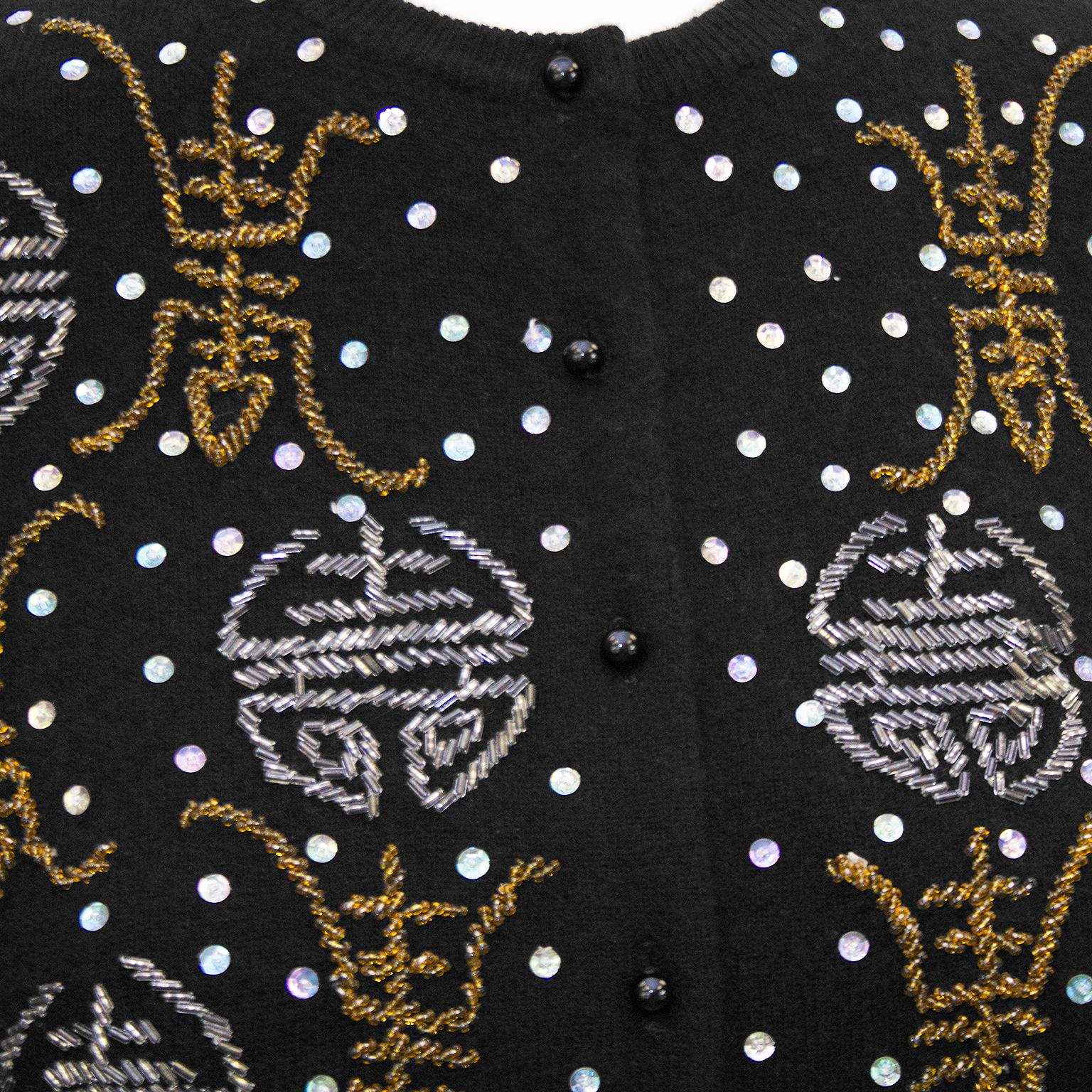 Cardigan noir des années 1950-60 orné de perles et de paillettes noires. Le pull est composé de laine d'agneau, d'angora et de nylon et comporte de minuscules boutons sphériques. Dou...