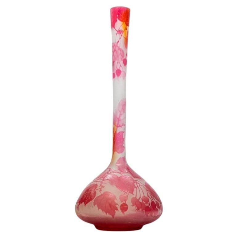 Cet exquis vase Art nouveau d'Émile Gallé à Nancy est une pièce maîtresse de la pièce. Signé E. Gallé. Grand vase d'armoire de forme banjo aplatie à décor de groseilles en verre cla...