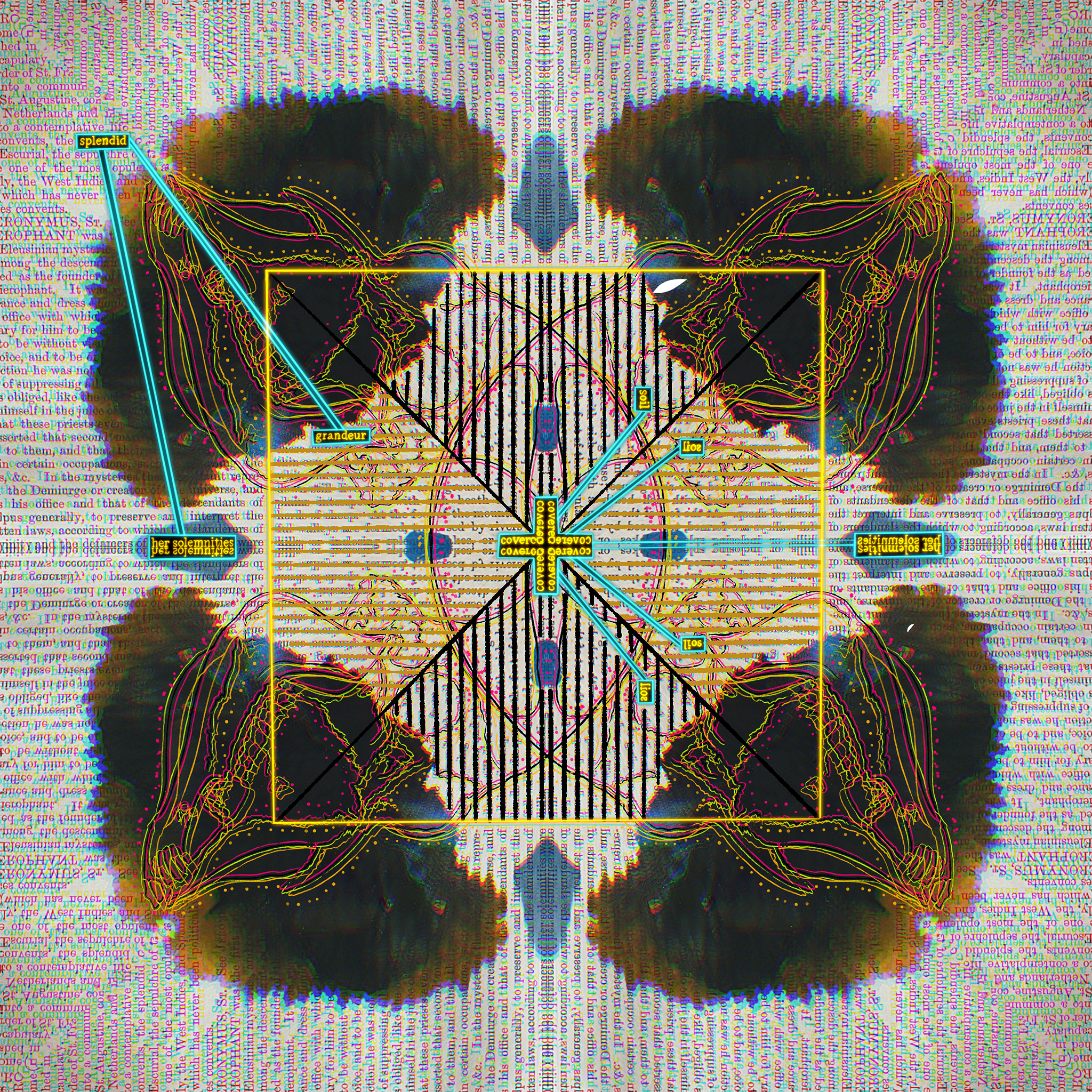 Erasure poetry + cut-up + continuous line drawing + collage + kaleidoscope = kaleidoscopic erasure poem. A kaleidoscopic erasure poem is a sigh, a sigil, a digital/traditional hybrid, a (hyper)textual parallel universe, a vortex of meaning. Shatter the word & perhaps we’ll know which way to go next?