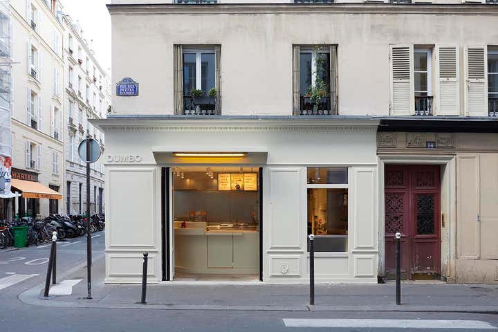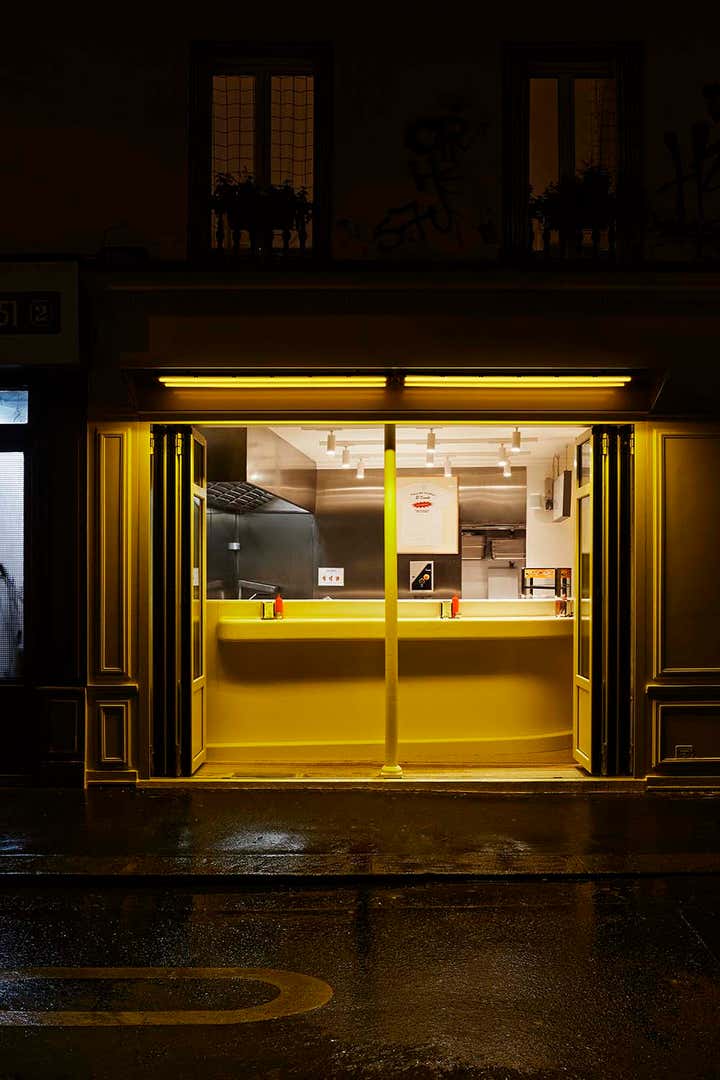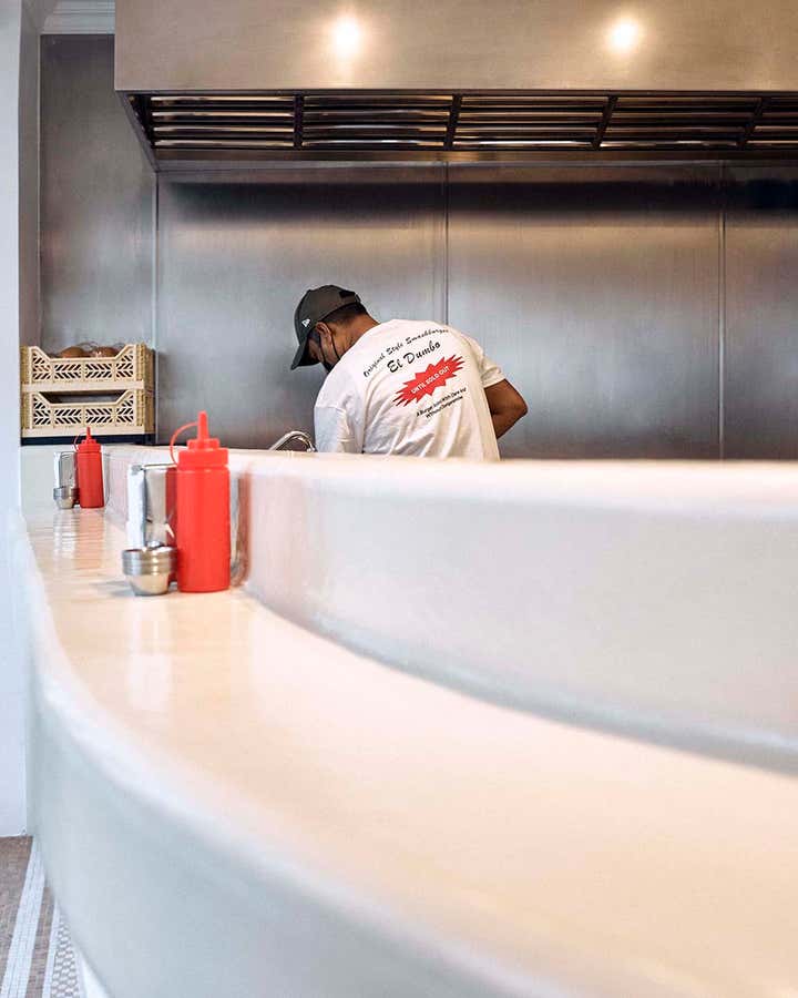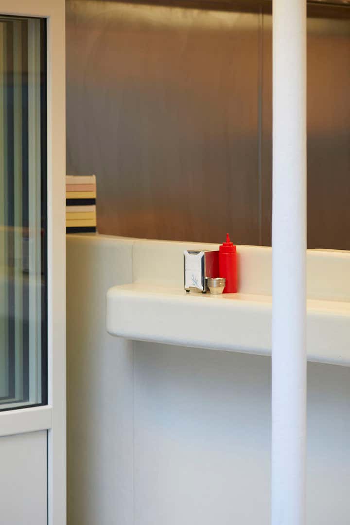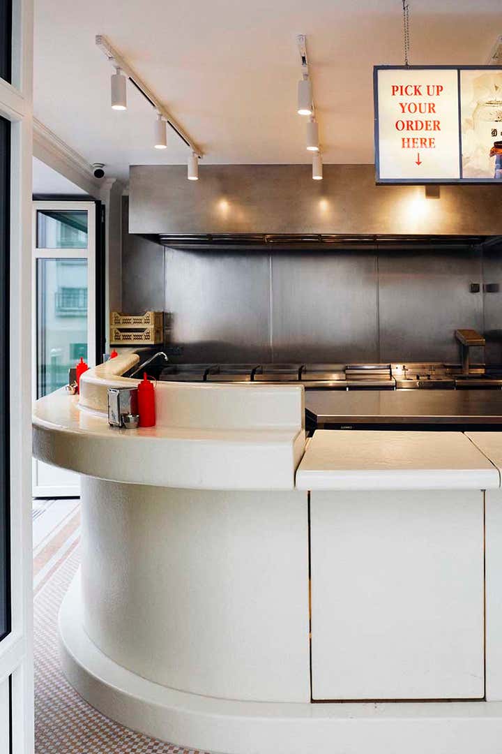 A real counterpoint to the exploration of colour that is its leitmotif, the new Dumbo stands out in Uchronia's career. With a large off-white bar - a monolith that functions as the centrepiece of a pure space - and stainless steel, the space is simple, without overhangs. This is a way of sublimating the excellence of the burgers and the pop colours - red of the ketchup or yellow of the mustards - that accompany them.